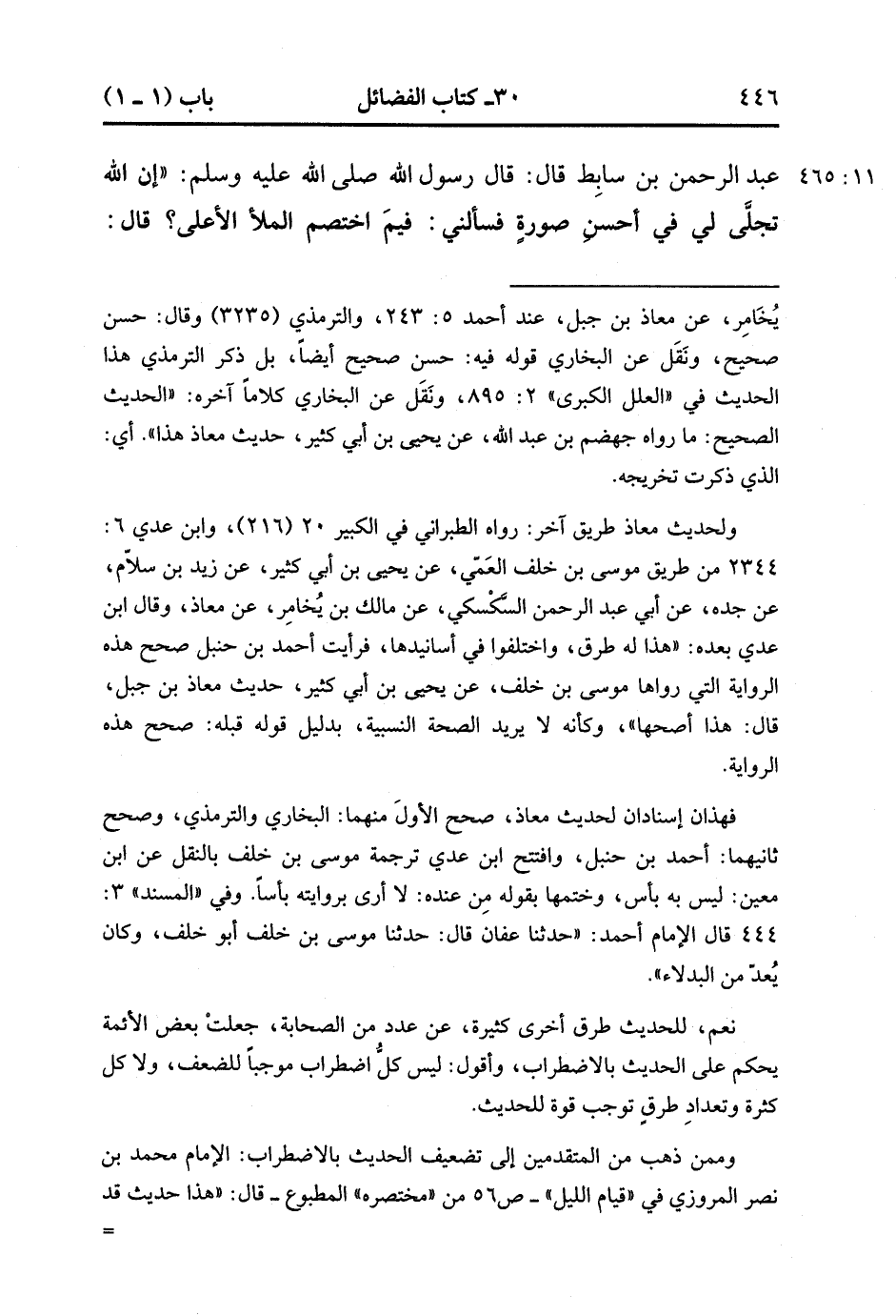 32364- حَدَّثَنَا عَبْدُ اللهِ بْنُ نُمَيْرٍ , قَالَ : حدَّثَنَا مُوسَى بْنُ مُسْلِمٍ ، عَنْ عَبْدِ الرَّحْمَنِ بْنِ سَابِطٍ ، قَالَ : قَالَ رَسُولُ اللهِ صَلَّى الله عَلَيْهِ وَسَلَّمَ : إنَّ اللَّهَ تَجَلَّى لِي فِي أَحْسَنِ صُورَةٍ فَسَأَلَنِي : فِيمَ اخْتَصَمَ الْمَلاَ الأَعْلَى ؟ قَالَ : فَقُلْتُ : رَبِّي لاَ عِلْمَ لِي بِهِ ، قَالَ : فَوَضَعَ يَدَهُ بَيْنَ كَتِفَيَّ حَتَّى وَجَدْتُ بَرْدَهَا بَيْنَ ثَدْيَىَّ ، أَوْ وَضَعَهَا بَيْنَ ثَدْيَيَّ حَتَّى وَجَدْتُ بَرْدَهَا بَيْنَ كَتِفَيَّ , فَمَا سَأَلَنِي عَنْ شَيْءٍ إلاَّ عَلِمْته. (11/464).
