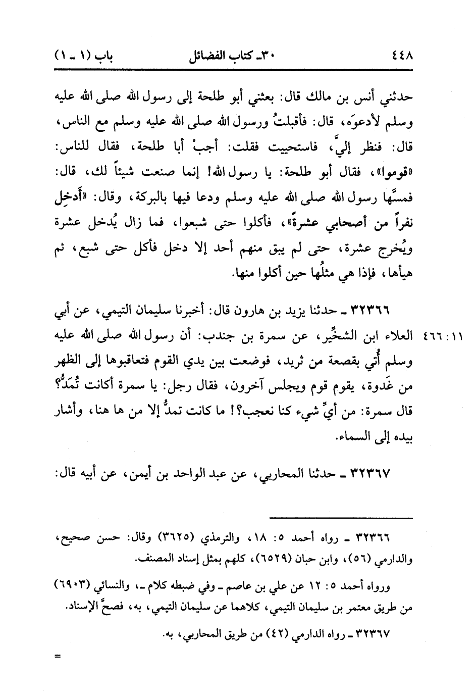 32366- حَدَّثَنَا يَزِيدُ بْنُ هَارُونَ , قَالَ : أَخْبَرَنَا سُلَيْمَانُ التَّيْمِيُّ ، عَنْ أَبِي الْعَلاَءِ بْنِ الشِّخِّيرِ ، عَنْ سَمُرَةَ بْنِ جُنْدُبٍ ؛ أَنَّ رَسُولَ اللهِ صَلَّى الله عَلَيْهِ وَسَلَّمَ أُتِيَ بِقَصْعَةٍ مِنْ ثَرِيدٍ فَوُضِعَتْ بَيْنَ يَدَيَ الْقَوْمِ فَتَعَاقَبُوهَا إلَى الظُّهْرِ مِنْ غَدْوَةٍ , يَقُومُ قَوْمٌ وَيَجْلِسُ آخَرُونَ ، فَقَالَ رَجُلٌ : يَا سَمُرَةُ أَكَانَتْ تُمَدُّ ؟ قَالَ سَمُرَةُ : مِنْ أَيِّ شَيْءٍ كُنَّا نَعْجَبُ ؟ مَا كَانَتْ تُمَدُّ إلاَّ مِنْ هَاهُنَا وَأَشَارَ بِيَدِهِ إلَى السَّمَاءِ. (11/465).