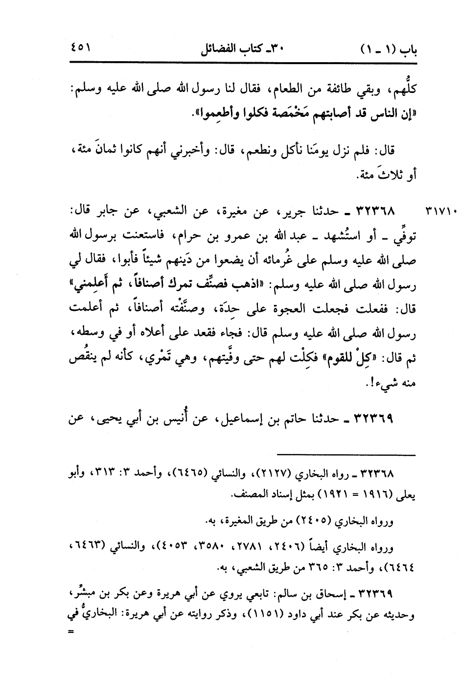 32368- حَدَّثَنَا جَرِيرٌ ، عَنْ مُغِيرَةَ ، عَنِ الشَّعْبِيِّ ، عَنْ جَابِرٍ ، قَالَ : تُوُفِّيَ - أَوِ اسْتُشْهِدَ - عَبْدُ اللهِ بْنُ عَمْرِو بْنِ حَرَامٍ , فَاسْتَعَنْتُ بِرَسُولِ اللهِ صَلَّى الله عَلَيْهِ وَسَلَّمَ عَلَى غُرَمَائِهِ أَنْ يَضَعُوا مِنْ دَيْنِهِمْ شَيْئًا , فَأَبَوْا ، فَقَالَ لِي رَسُولُ اللهِ صَلَّى الله عَلَيْهِ وَسَلَّمَ : اذْهَبْ فَصَنِّفْ تَمْرَك أَصْنَافًا ، ثُمَّ أَعْلِمْنِي ، قَالَ : فَفَعَلْت فَجَعَلْتُ الْعَجْوَةَ عَلَى حدَةٍ ، وَصَنَّفْته أَصْنَافًا ، ثُمَّ أَعْلَمْت رَسُولَ اللهِ صَلَّى الله عَلَيْهِ وَسَلَّمَ قَالَ : فَجَاءَ فَقَعَدَ عَلَى أَعْلاَهُ ، أَوْ فِي وَسَطِهِ ، ثُمَّ قَالَ : كِلْ لِلْقَوْمِ ، فَكِلْتُ لَهُمْ حَتَّى وَفَّيْتُهُمْ ، وَهِيَ تَمْرِي ، كَأَنَّهُ لَمْ يَنْقُصْ مِنْهُ شَيْءٌ. (11/469.