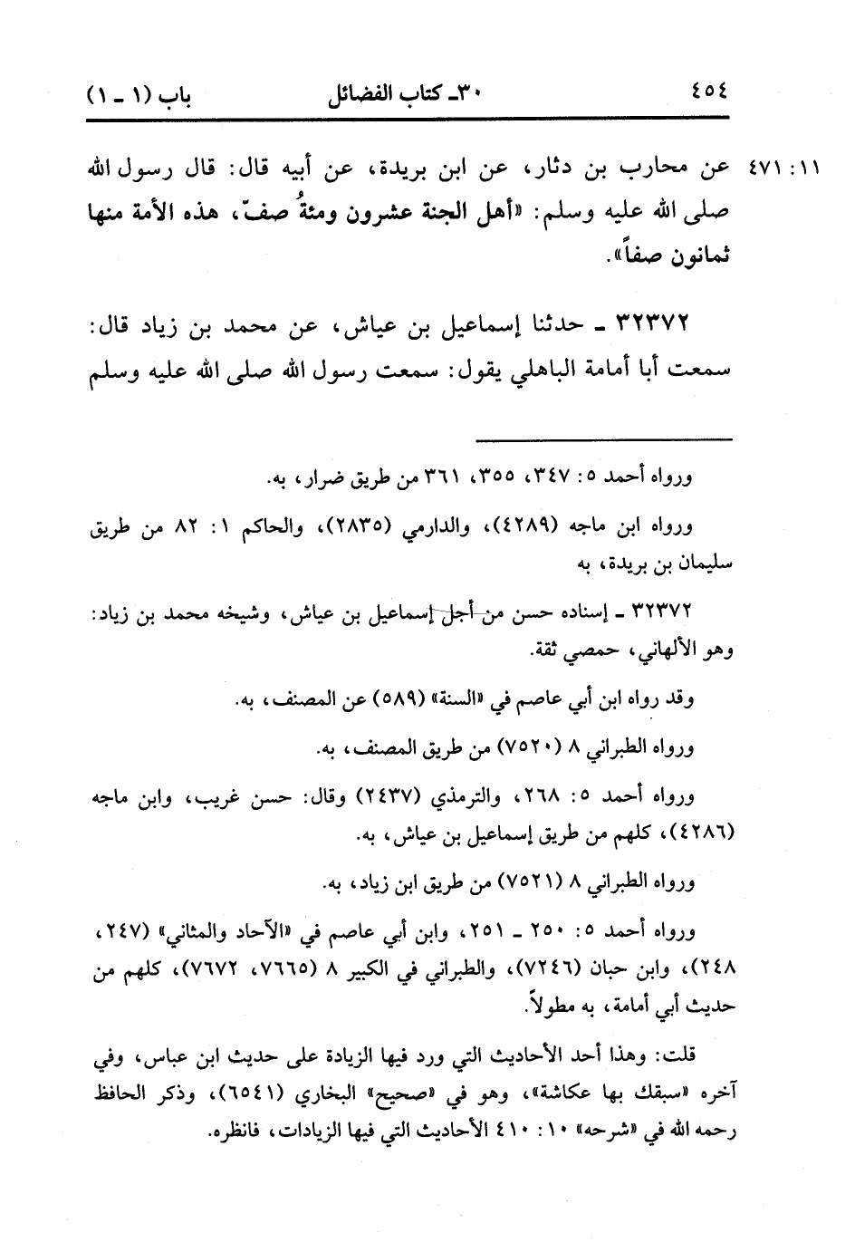 32371- حَدَّثَنَا مُحَمَّدُ بْنُ فُضَيْلٍ ، عَنْ أَبِي سِنَانٍ ضِرَارِ بْنِ مُرَّةَ ، عَنْ مُحَارِبِ بْنِ دِثَارٍ ، عَنِ ابْنِ بُرَيْدَةَ ، عَنْ أَبِيهِ ، قَالَ : قَالَ رَسُولُ اللهِ صَلَّى الله عَلَيْهِ وَسَلَّمَ : أَهْلُ الْجَنَّةِ عِشْرُونَ وَمِئَةُ صَفٍّ ، هَذِهِ الأُمَّةُ مِنْهَا ثَمَانُونَ صَفًّا. (11/470).