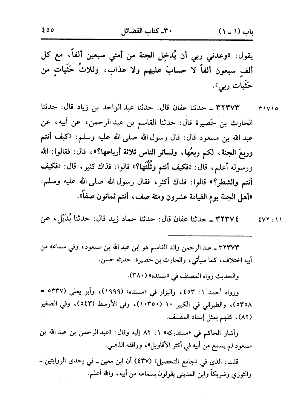 32373- حَدَّثَنَا عَفَّانُ , قَالَ : حدَّثَنَا عَبْدُ الْوَاحِدِ بْنُ زِيَادٍ ، قَالَ : حَدَّثَنَا الْحَارِثُ بْنُ حَصِيرَةَ ، قَالَ : حَدَّثَنَا الْقَاسِمُ بْنُ عَبْدِ الرَّحْمَنِ ، عَنْ أَبِيهِ ، عَنْ عَبْدِ اللهِ بْنِ مَسْعُودٍ ، قَالَ : قَالَ رَسُولُ اللهِ صَلَّى الله عَلَيْهِ وَسَلَّمَ : كَيْفَ أَنْتُمْ وَرُبُعُ الْجَنَّةِ , لَكُمْ رُبُعُهَا , وَلِسَائِرِ النَّاسِ ثَلاَثَةُ أَرْبَاعِهَا ، قَالَ : فَقَالُوا : اللَّهُ وَرَسُولُهُ أَعْلَمُ ، قَالَ : فَكَيْفَ أَنْتُمْ وَثُلُثُهَا ، قَالُوا : فَذَاكَ كَثِيرٌ ، قَالَ : فَكَيْفَ أَنْتُمْ وَالشَّطْرُ ، قَالُوا : فَذَاكَ أَكْثَرُ ، فَقَالَ رَسُولُ اللهِ صَلَّى الله عَلَيْهِ وَسَلَّمَ : أَهْلُ الْجَنَّةِ يَوْمَ الْقِيَامَةِ عِشْرُونَ وَمِئَةُ صَفٍ , أَنْتُمْ ثَمَانُونَ صَفًّا. (11/471).