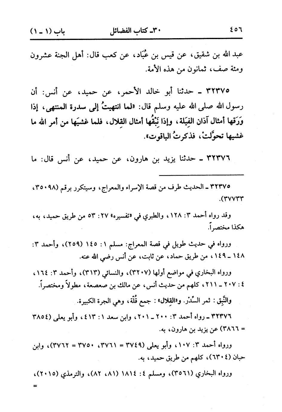 32375- حَدَّثَنَا أَبُو خَالِدٍ الأَحْمَرُ ، عَنْ حُمَيْدٍ ، عَنْ أَنَسٍ ؛ أَنَّ رَسُولَ اللهِ صَلَّى الله عَلَيْهِ وَسَلَّمَ قَالَ : لَمَّا انْتَهَيْت إلَى سِدْرَةِ الْمُنْتَهَى إذَا وَرَقُهَا أَمْثَالُ آذَانِ الْفِيلَةِ وَإِذَا نَبْقُهَا أَمْثَالُ الْقِلاَلِ ، فَلَمَّا غَشِيَهَا مِنْ أَمْرِ اللهِ مَا غَشِيَهَا تَحَوَّلَتْ فَذَكَرْت الْيَاقُوتَ.