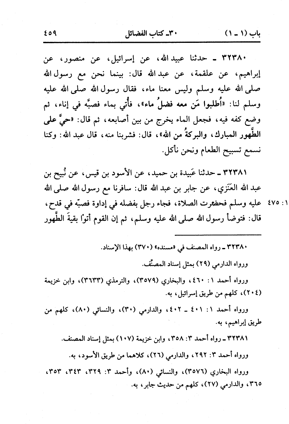 32381- حَدَّثَنَا عَبِيدَةُ بْنُ حُمَيْدٍ ، عَنِ الأَسْوَدِ بْنِ قَيْسٍ ، عَنْ نُبَيْحِ بْنِ عَبْدِ اللهِ الْعَنَزِيِّ ، عَنْ جَابِرِ بْنِ عَبْدِ اللهِ ، قَالَ : سَافَرْنَا مَعَ رَسُولِ اللهِ صَلَّى الله عَلَيْهِ وَسَلَّمَ فَحَضَرَت الصَّلاَةُ , فَجَاءَ رَجُلٌ بِفَضْلِهِ فِي إدَاوَةٍ فَصَبَّهُ فِي قَدَحٍ ، قَالَ : فَتَوَضَّأَ رَسُولُ اللهِ صَلَّى الله عَلَيْهِ وَسَلَّمَ ، ثُمَّ إنَّ الْقَوْمَ أَتَوْا بَقِيَّةَ الطَّهُورِ وَقَالُوا : تَمَسَّحُوا تَمَسَّحُوا ، قَالَ : فَسَمِعَهُمْ رَسُولُ اللهِ صَلَّى الله عَلَيْهِ وَسَلَّمَ ، فَقَالَ : عَلَى رِسْلِكُمْ ، قَالَ : فَضَرَبَ رَسُولُ اللهِ صَلَّى الله عَلَيْهِ وَسَلَّمَ يَدَهُ فِي الْقَدَحِ فِي جَوْفِ الْمَاءِ ، ثُمَّ قَالَ : أَسْبِغُوا الطَّهُورَ ، قَالَ : فَقَالَ جَابِرُ بْنُ عَبْدِ اللهِ : وَالَّذِي أَذْهَبَ بَصَره لَقَدْ رَأَيْت الْمَاءَ يَخْرُجُ مِنْ بَيْنِ أَصَابِعِ رَسُولِ اللهِ صَلَّى الله عَلَيْهِ وَسَلَّمَ فَمَا رَفَعَ يَدَهُ حَتَّى تَوَضَّؤُوا أَجْمَعُونَ ، فَقَالَ الأَسْوَدُ : حَسِبتهُ قَالَ : كُنَّا مِئَتَيْنِ أَوْ زِيَادَةٍ. (11/474).