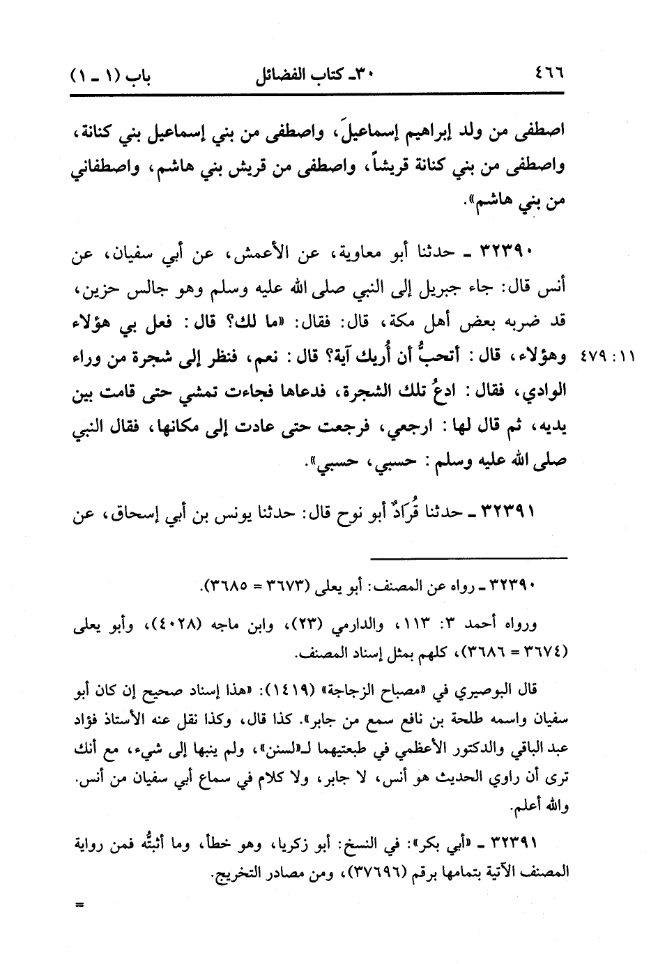 32390- حَدَّثَنَا أَبُو مُعَاوِيَةَ ، عَنِ الأَعْمَشِ ، عَنْ أَبِي سُفْيَانَ ، عَنْ أَنَسٍ ، قَالَ : جَاءَ جِبْرِيلُ إلَى النَّبِيِّ صَلَّى الله عَلَيْهِ وَسَلَّمَ وَهُوَ جَالِسٌ حَزِينٌ قَدْ ضَرَبَهُ بَعْضُ أَهْلِ مَكَّةَ ، قَالَ : فَقَالَ : مَا لَك ؟ قَالَ : فَعَلَ بِي هَؤُلاَءِ وَهَؤُلاَءِ ، قَالَ : أَتُحِبُّ أَنْ أُرِيَك آيَةً ؟ قَالَ : نَعَمْ , فَنَظَرَ إلَى شَجَرَةٍ مِنْ وَرَاءِ الْوَادِي ، فَقَالَ : ادْعُ تِلْكَ الشَّجَرَةَ , فَدَعَاهَا فَجَاءَتْ تَمْشِي حَتَّى قَامَتْ بَيْنَ يَدَيْهِ ، ثُمَّ قَالَ لَهَا : ارْجِعِي , فَرَجَعَتْ حَتَّى عَادَتْ إِلَى مَكَانِهَا ، فَقَالَ النَّبِيُّ صَلَّى الله عَلَيْهِ وَسَلَّمَ : حَسْبِي حَسْبِي. (11/478).