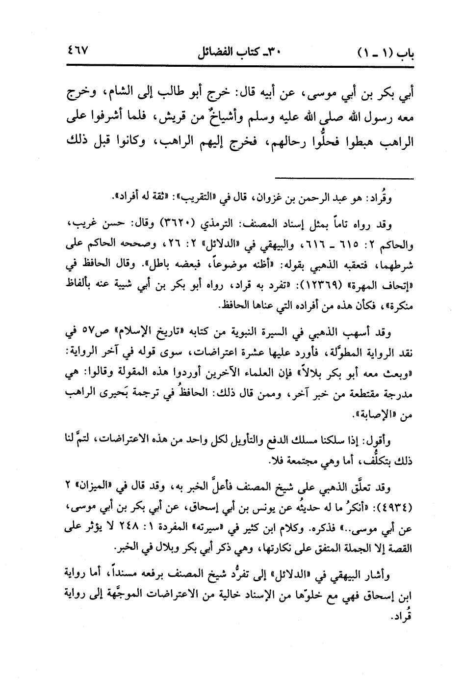 32391- حَدَّثَنَا قُرَادُ أبو نُوحٍ , قَالَ : حدَّثَنَا يُونُسُ بْنُ أَبِي إِسْحَاقَ ، عَنْ أَبِي بَكْرٍ بْنِ أَبِي مُوسَى ، عَنْ أَبِيهِ ، قَالَ : خَرَجَ أَبُو طَالِبٍ إلَى الشَّامِ وَخَرَجَ مَعَهُ رَسُولُ اللهِ صَلَّى الله عَلَيْهِ وَسَلَّمَ وَأَشْيَاخٌ مِنْ قُرَيْشٍ ، فَلَمَّا أَشْرَفُوا عَلَى الرَّاهِبِ هَبَطُوا فَحَلُّوا رِحَالَهُمْ , فَخَرَجَ إلَيْهِمَ الرَّاهِبُ ، وَكَانُوا قَبْلَ ذَلِكَ يَمُرُّونَ فَلاَ يَخْرُجُ إلَيْهِمْ ، وَلاَ يَلْتَفِتُ ، قَالَ : فَهُمْ يَحِلُّونَ رِحَالَهُمْ فَجَعَلَ يَتَخَلَّلُهُمْ حَتَّى جَاءَ فَأَخَذَ بِيَدِ رَسُولِ اللهِ صَلَّى الله عَلَيْهِ وَسَلَّمَ ، فَقَالَ : هَذَا سَيِّدُ الْعَالَمِينَ , هَذَا رَسُولُ رَبِّ الْعَالَمِينَ , هَذَا يَبْعَثُهُ اللَّهُ رَحْمَةً لِلْعَالَمِينَ ، فَقَالَ لَهُ أَشْيَاخٌ مِنْ قُرَيْشٍ : مَا عِلْمُك ؟ فَقَالَ : إنَّكُمْ حِينَ أَشْرَفْتُمْ مِنَ الْعَقَبَةِ لَمْ يَبْقَ شَجَرٌ ، وَلاَ حَجَرٌ إلاَّ خَرَّ سَاجِدًا ، وَلاَ يَسْجُدُون إلاَّ لِنَبِيٍّ. (11/479).