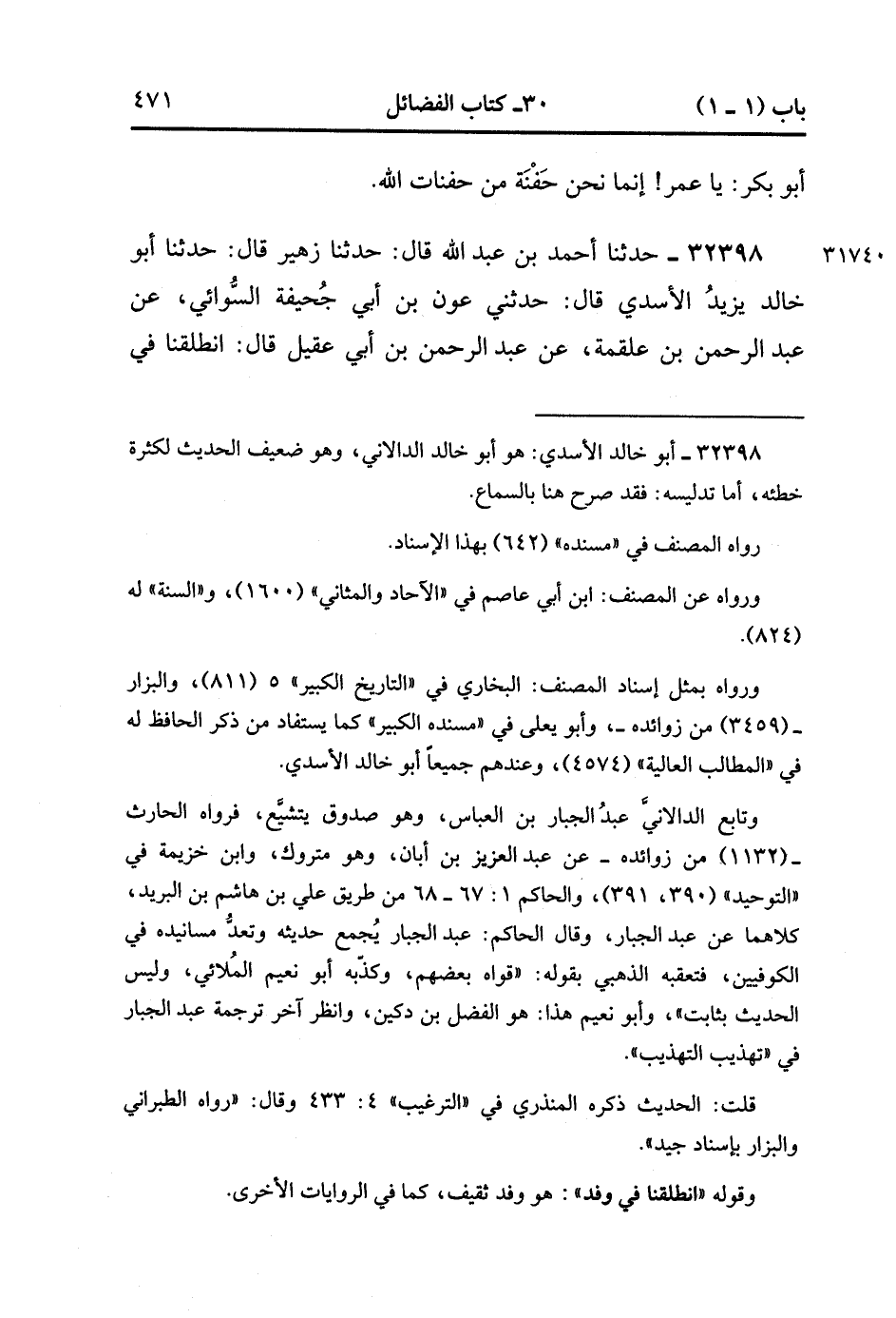 32398- حَدَّثَنَا أَحْمَدُ بْنُ عَبْدِ اللهِ , قَالَ : حدَّثَنَا زُهَيْرٌ ، قَالَ : حَدَّثَنَا أَبُو خَالِدٍ يَزِيدُ الأَسَدِيُّ ، قَالَ : حَدَّثَنِي عَوْنُ بْنُ أَبِي جُحَيْفَةَ السُّوَائِيُّ ، عَنْ عَبْدِ الرَّحْمَنِ بْنِ عَلْقَمَةَ ، عَنْ عَبْدِ الرَّحْمَنِ بْنِ أَبِي عَقِيلٍ ، قَالَ : انْطَلَقْنَا فِي وَفْدٍ فَأَتَيْنَا رَسُولَ اللهِ صَلَّى الله عَلَيْهِ وَسَلَّمَ ، فَقَالَ قَائِلٌ مِنَّا : يَا رَسُولَ اللهِ , أَلاَ سَأَلْت رَبَّك مُلْكًا كَمُلْكِ سُلَيْمَانَ ، فَضَحِكَ وَقَالَ : لَعَلَّ لِصَاحِبِكُمْ عِنْدَ اللهِ أَفْضَلَ مِنْ مُلْكِ سُلَيْمَانَ , إنَّ اللَّهَ لَمْ يَبْعَثْ نَبِيًّا إلاَّ أَعْطَاهُ دَعْوَةً , فَمِنْهُمْ مَنِ اتَّخَذَ بِهَا دُنْيَا فَأُعْطِيَهَا , وَمِنْهُمْ مَنْ دَعَا بِهَا عَلَى قَوْمِهِ إذْ عَصَوْهُ فَأُهْلِكُوا ، وَإِنَّ اللَّهَ أَعْطَانِي دَعْوَةً فَاخْتَبَأْتُهَا عِنْدَ رَبِّي شَفَاعَةً لأُمَّتِي يَوْمَ الْقِيَامَةِ. (11/482).