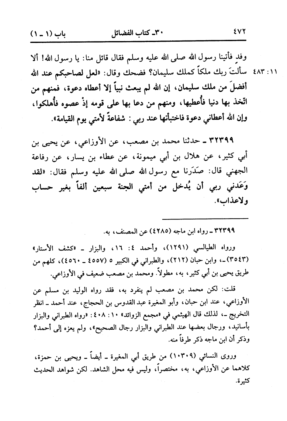 32399- حَدَّثَنَا مُحَمَّدُ بْنُ مُصْعَبٍ ، عَنِ الأَوْزَاعِيِّ ، عَنْ يَحْيَى بْنِ أَبِي كَثِيرٍ ، عَنْ هِلاَلِ بْنِ أَبِي مَيْمُونَةَ ، عَنْ عَطَاءِ بْنِ يَسَارٍ ، عَنْ رِفَاعَةَ الْجُهَنِيِّ ، قَالَ : صدَرْنَا مَعَ رَسُولِ اللهِ صَلَّى الله عَلَيْهِ وَسَلَّمَ فَقَالَ : لَقَدْ وَعَدَنِي رَبِّي أَنْ يُدْخِلَ مِنْ أُمَّتِي الْجَنَّةَ سَبْعِينَ أَلْفًا بِغَيْرِ حِسَابٍ وَلاَ عَذَابٍ. (11/483.