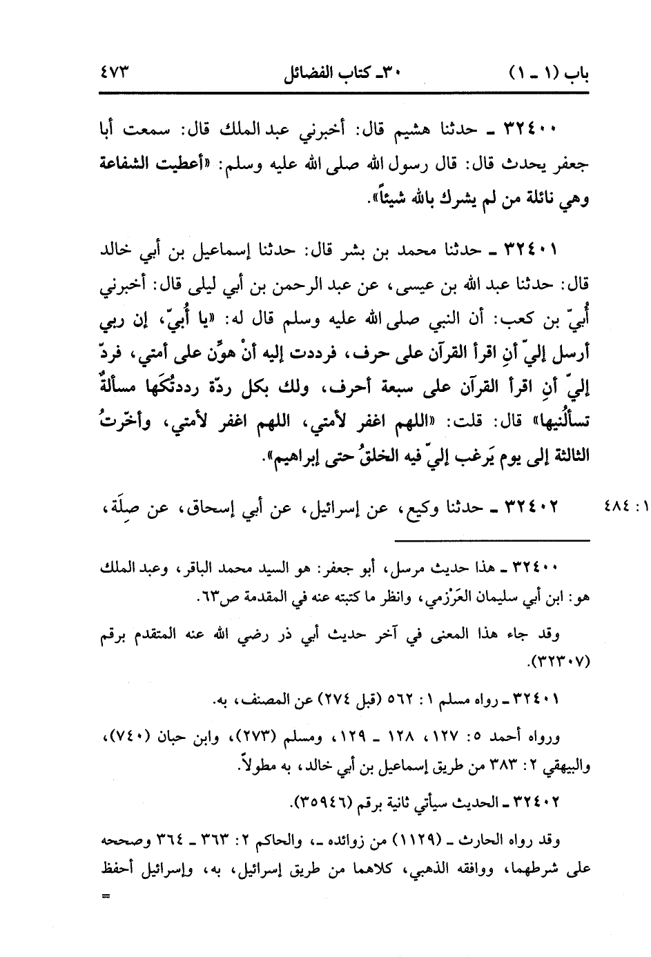32401- حَدَّثَنَا مُحَمَّدُ بْنُ بِشْرٍ , قَالَ : حدَّثَنَا إسْمَاعِيلُ بْنُ أَبِي خَالِدٍ ، قَالَ : حَدَّثَنَا عَبْدُ اللهِ بْنُ عِيسَى ، عَنْ عَبْدِ الرَّحْمَنِ بْنِ أَبِي لَيْلَى ، قَالَ : أَخْبَرَنِي أُبَيّ بْنُ كَعْبٍ ؛ أَنَّ النَّبِيَّ صَلَّى الله عَلَيْهِ وَسَلَّمَ قَالَ لَهُ : يَا أُبَي , إنَّ رَبِّي أَرْسَلَ إلَيَّ أَنْ أَقْرَأَ الْقُرْآنَ عَلَى حَرْفٍ , فَرَدَدْت إلَيْهِ أَنْ هَوِّنْ عَلَى أُمَّتِي , فَرَدَّ إلَيَّ أَنْ أَقْرَأَ الْقُرْآنَ عَلَى سَبْعَةِ أَحْرُفٍ , وَلَك بِكُلِّ رَدَّةٍ رَدَدْتُكَهَا مَسْأَلَةٌ تَسْأَلُنِيهَا ، قَالَ : قُلْتُ : اللَّهُمَّ اغْفِرْ لأُمَّتِي , اللَّهُمَّ اغْفِرْ لأُمَّتِي , وَأَخَّرْتُ الثَّالِثَةَ إلَى يَوْمٍ يَرْغَبُ إلَيَّ فِيهِ الْخَلْقُ حَتَّى إبْرَاهِيمُ. (11/483).