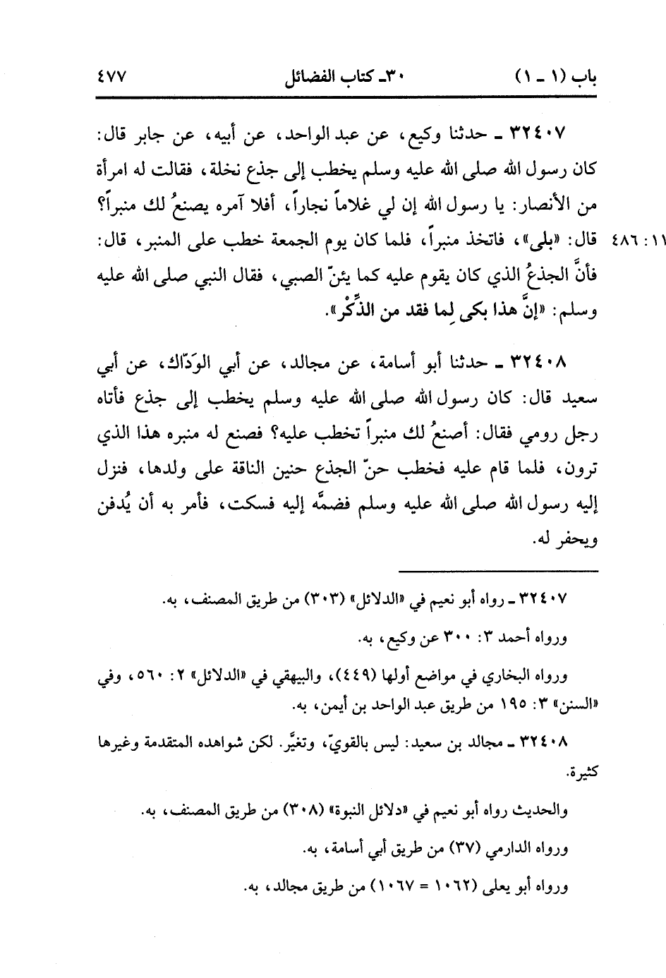 32407- حَدَّثَنَا وَكِيعٌ ، عَنْ عَبْدِ الْوَاحِدِ ، عَنْ أَبِيهِ ، عَنْ جَابِرٍ ، قَالَ : كَانَ رَسُولُ اللهِ صَلَّى الله عَلَيْهِ وَسَلَّمَ يَخْطُبُ إلَى جِذْعِ نَخْلَةٍ ، فَقَالَتْ لَهُ امْرَأَةٌ مِنَ الأَنْصَارِ : يَا رَسُولَ اللهِ , إنَّ لِي غُلاَمًا نَجَّارًا , أَفَلاَ آمُرُهُ يَصْنَعُ لَك مِنْبَرًا ؟ قَالَ : بَلَى , فَاتَّخَذَ مِنْبَرًا ، فَلَمَّا كَانَ يَوْمُ الْجُمُعَةِ خَطَبَ عَلَى الْمِنْبَرِ ، قَالَ : فَأَنَّ الْجِذْعُ الَّذِي كَانَ يَقُومُ عَلَيْهِ كَمَا يَإن الصَّبِيِّ ، فَقَالَ النَّبِيُّ صَلَّى الله عَلَيْهِ وَسَلَّمَ : إنَّ هَذَا بَكَى لِمَا فَقَدَ مِنَ الذِّكْرِ. (11/485).