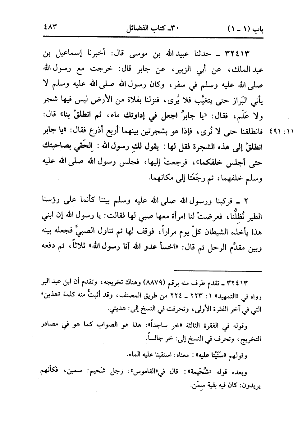 32413- حَدَّثَنَا عُبَيْدُ اللهِ بْنُ مُوسَى , قَالَ : أَخْبَرَنَا إسْمَاعِيلُ بْنُ عَبْدِ الْمَلِكِ ، عَنْ أَبِي الزُّبَيْرِ ، عَنْ جَابِرٍ ، قَالَ : خَرَجْت مَعَ رَسُولِ اللهِ صَلَّى الله عَلَيْهِ وَسَلَّمَ فِي سَفَرٍ , وَكَانَ رَسُولُ اللهِ صَلَّى الله عَلَيْهِ وَسَلَّمَ لاَ يَأْتِي الْبَرَازَ حَتَّى يَتَغَيَّبَ فَلاَ يُرَى , فَنَزَلْنَا بِفَلاَةٍ مِنَ الأَرْضِ لَيْسَ فِيهَا شَجَرَةٌ وَلاَ عَلَمٌ ،(11/490) فَقَالَ : يَا جَابِرُ اجْعَلْ فِي إِدَاوَتِكَ مَاء ، ثُمَّ انْطَلَقَ بِنَا ، قَالَ : فَانْطَلَقْنَا حَتَّى لاَ نُرَى فَإِذَا هُوَ بِشَجَرَتَيْنِ بينهما أَرْبَعَة أَذْرعْ , فَقَالَ : يَا جَابِر انْطَلِقْ إلَى هَذِهِ الشَّجَرَةِ فَقُلْ لَهَا : يَقُولُ لَك رَسُولُ اللهِ صَلَّى الله عَلَيْهِ وَسَلَّمَ : الْحَقِي بِصَاحِبَتِكَ حَتَّى أَجْلِسَ خَلْفَكُمَا , فَرَجَعَتْ إلَيْهَا فَجَلَسَ رَسُولُ اللهِ صَلَّى الله عَلَيْهِ وَسَلَّمَ خَلْفَهُمَا ، ثُمَّ رَجَعَتَا إلَى مَكَانِهِمَا.