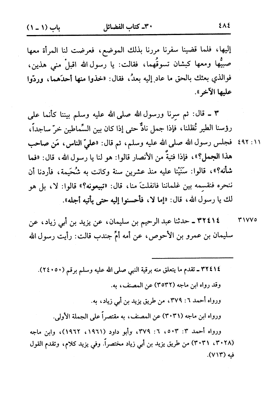 قَالَ : ثُمَّ سِرْنَا وَرَسُولُ اللهِ صَلَّى الله عَلَيْهِ وَسَلَّمَ بَيْنَنَا كَأَنَّمَا عَلَى رُؤُوسِنَا الطَّيْرُ تُظِلُّنَا , فَإِذَا جَمَلٌ نَادٌّ حَتَّى إذَا كَانَ بَيْنَ السِّمَاطَيْنِ خَرَّ سَاجِدًا , فَجَلَسَ رَسُولُ اللهِ صَلَّى الله عَلَيْهِ وَسَلَّمَ ، ثُمَّ قَالَ : عَلَيَّ النَّاسَ , (11/491) مَنْ صَاحِبُ هَذَا الْجَمَلِ ؟ فَإِذَا فِتْيَةٌ مِنَ الأَنْصَارِ ، قَالُوا : هُوَ لَنَا يَا رَسُولَ اللهِ ، قَالَ : فَمَا شَأْنُهُ ؟ قَالُوا : سَنَيْنَا عَلَيْهِ مُنْذُ عِشْرِينَ سَنَةً , وَكَانَتْ بِهِ شُحَيْمَةٌ , فَأَرَدْنَا أَنْ نَنْحَرَهُ , فَنَقْسِمُهُ بَيْنَ غِلْمَانِنَا , فَانْفَلَتَ مِنَّا ، قَالَ : تَبِيعُونَهُ ، قَالُوا : لاَ , بَلْ هُوَ لَك يَا رَسُولَ اللهِ ، قَالَ : إمَّا لاَ فَأَحْسِنُوا إلَيْهِ حَتَّى يَأْتِيَهُ أَجَلُهُ. (11/491.