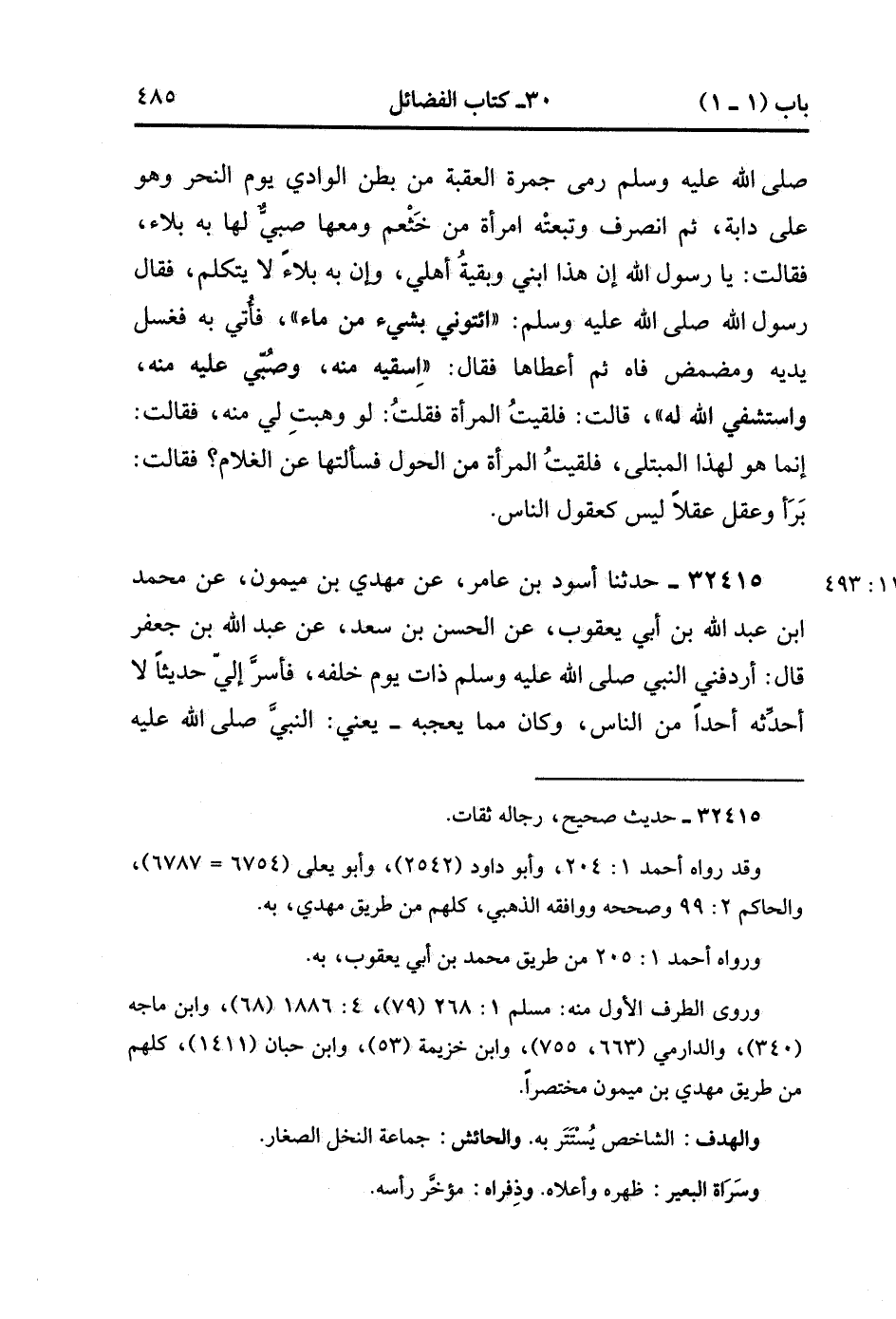 32414- حَدَّثَنَا عَبْدُ الرَّحِيمِ بْنُ سُلَيْمَانَ ، عَنْ يَزِيدَ بْنِ أَبِي زِيَادٍ ، عَنْ سُلَيْمَانَ بْنِ عَمْرٍو بن الأَحْوَصِ ، عَنْ أُمِّهِ أُمِّ جُنْدُبٍ ، قَالَتْ : رَأَيْت رَسُولَ اللهِ صَلَّى الله عَلَيْهِ وَسَلَّمَ رَمَى جَمْرَةَ الْعَقَبَةِ مِنْ بَطْنِ الْوَادِي يَوْمَ النَّحْرِ وَهُوَ عَلَى دَابَّةٍ ، ثُمَّ انْصَرَفَ وَتَبِعَتْهُ امْرَأَةٌ مِنْ خَثْعَمَ , وَمَعَهَا صَبِيٌّ لَهَا بِهِ بَلاَءٌ ، فَقَالَتْ : يَا رَسُولَ اللهِ , إنَّ هَذَا ابْنِي وَبَقِيَّةُ أَهْلِي ، وَإِنَّ بِهِ بَلاَءً لاَ يَتَكَلَّمُ ، فَقَالَ رَسُولُ اللهِ صَلَّى الله عَلَيْهِ وَسَلَّمَ : ائْتُونِي بِشَيْءٍ مِنْ مَاءٍ , فَأُتِيَ بِهِ فَغَسَلَ يَدَيْهِ وَمَضْمَضَ فَاهُ ، ثُمَّ أَعْطَاهَا ، فَقَالَ : اسْقِيهِ مِنْهُ ، وَصُبِّي عَلَيْهِ مِنْهُ ، وَاسْتَشْفِي اللَّهَ لَهُ ، قَالَتْ : فَلَقِيتُ الْمَرْأَةَ ، فَقُلْتُ : لَوْ وَهَبْت لِي مِنْهُ ، فَقَالَتْ : إنَّمَا هُوَ لِهَذَا الْمُبْتَلَى, فَلَقِيت الْمَرْأَةَ مِنَ الْحَوْلِ فَسَأَلْتُهَا عَنِ الْغُلاَمِ ، فَقَالَتْ : بَرَأَ وَعَقَلَ عَقْلاً لَيْسَ كَعُقُولِ النَّاسِ. (11/492).
