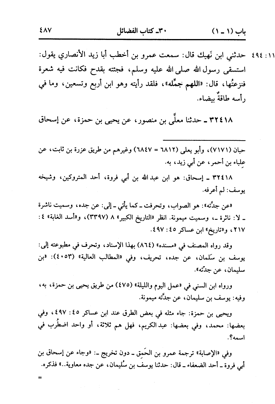 32417- حَدَّثَنَا زَيْدُ بْنُ الْحُبَابِ ، قَالَ : حدَّثَنِي حُسَيْنُ بْنُ وَاقِدٍ ، قَالَ : حَدَّثَنِي ابْنِ نَهِيكٍ ، قَالَ : سَمِعْتُ عَمْرَو بْنَ أَخْطَبَ أَبَا زَيْدٍ الأَنْصَارِيَّ ، يَقُولُ : اسْتَسْقَى رَسُولُ اللهِ صَلَّى الله عَلَيْهِ وَسَلَّمَ فَجِئْتُهُ بِقَدَحٍ , فَكَانَتْ فِيهِ شَعْرَةٌ فَنَزَعَهَا ، قَالَ : اللَّهُمَّ جَمِّلْهُ , فَلَقَدْ رَأَيْتُهُ وَهُوَ ابْنُ أَرْبَعٍ وَتِسْعِينَ ، وَمَا فِي رَأْسِهِ طَاقَةٌ بَيْضَاءُ. (11/493).
