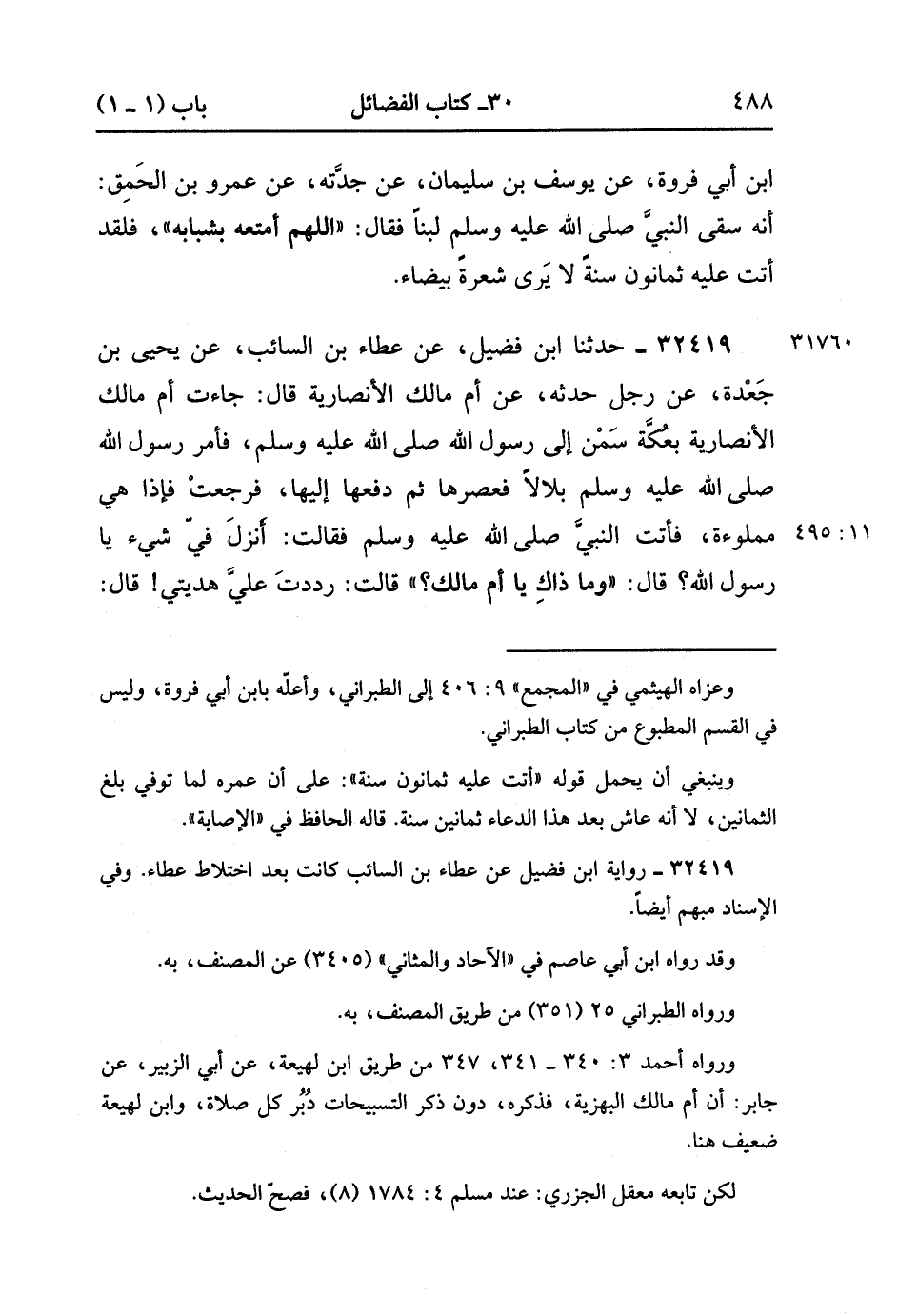 32418- حَدَّثَنَا مُعَلَّى بْنُ مَنْصُورٍ ، عَنْ يَحْيَى بْنِ حَمْزَةَ ، عَنْ إِسْحَاقَ بْنِ أَبِي فَرْوَةَ ، عَنْ يُوسُفَ بْنِ سُلَيْمَانَ ، عَنْ جَدَّتَه ، عَنْ عَمْرِو بْنِ الْحَمِقِ : أنَّهُ سَقَى النَّبِيَّ صَلَّى الله عَلَيْهِ وَسَلَّمَ لَبَنًا ، فَقَالَ : اللَّهُمَّ أَمْتِعْهُ بِشَبَابِهِ , فَلَقَدْ أَتَتْ عَلَيْهِ ثَمَانُونَ سَنَةً لاَ يَرَى شَعَرَةً بَيْضَاءَ. (11/494).
