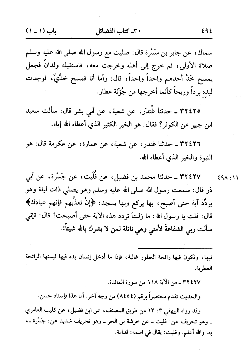 32427- حَدَّثَنَا مُحَمَّدُ بْنُ فُضَيْلٍ ، عَنْ فُلَيت ، عَنْ جَسْرَةَ ، عَنْ أَبِي ذَرٍّ ، قَالَ : سَمِعْتُ رَسُولَ اللهِ صَلَّى الله عَلَيْهِ وَسَلَّمَ وَهُوَ يُصَلِّي ذَاتَ لَيْلَةٍ وَهُوَ يُرَدِّدُ آيَةً حَتَّى أَصْبَحَ ، بِهَا يَرْكَعُ ، وَبِهَا يَسْجُدُ {إنْ تُعَذِّبْهُمْ فَإِنَّهُمْ عِبَادُك} ، قَالَ : قُلْتُ : يَا رَسُولَ اللهِ , مَا زِلْت تُرَدِّدُ هَذِهِ الآيَةَ حَتَّى أَصْبَحْت ، قَالَ : إنِّي سَأَلْت رَبِّي الشَّفَاعَةَ لأُمَّتِي وَهِيَ نَائِلَةٌ لِمَنْ لاَ يُشْرِكُ بِاللهِ شَيْئًا. (11/497).