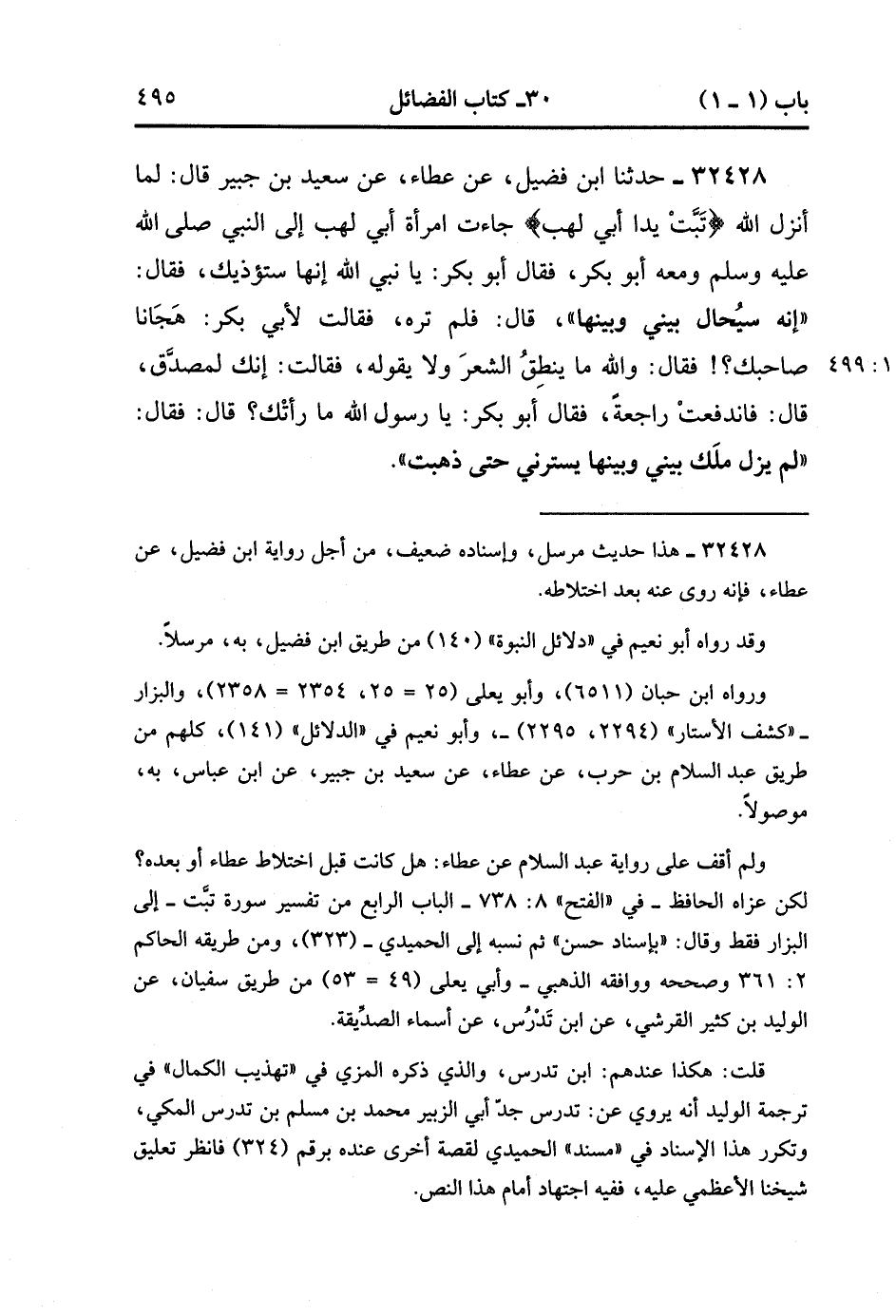 32428- حَدَّثَنَا ابْنُ فُضَيْلٍ ، عَنْ عَطَاءٍ ، عَنْ سَعِيدِ بْنِ جُبَيْرٍ ، قَالَ : لَمَّا أَنْزَلَ اللَّهُ : {تَبَّتْ يَدَا أَبِي لَهَبٍ} جَاءَتِ امْرَأَةُ أَبِي لَهَبٍ إلَى النَّبِيِّ صَلَّى الله عَلَيْهِ وَسَلَّمَ وَمَعَهُ أَبُو بَكْرٍ ، فَقَالَ أَبُو بَكْرٍ : يَا نَبِيَّ اللهِ ، أَنَّهَا سَتُؤذيك ، فَقَالَ : إِنَّهُ سَيُحَالُ بَيْنِي وَبَيْنَهَا ، قَالَ : فَلَمْ تَرَهُ ، فَقَالَتْ لأَبِي بَكْرٍ : هَجَانَا صَاحِبُك ، فَقَالَ : وَاللهِ مَا يَنْطِقُ الشِّعْرَ وَلاَ يَقُولُهُ ، فَقَالَتْ : إنَّك لَمُصَدَّقٌ ، قَالَ : فَانْدَفَعَتْ رَاجِعَةً ، فَقَالَ أَبُو بَكْرٍ : يَا رَسُولَ اللهِ , مَا رَأَتْك ، قَالَ : فَقَالَ : لَمْ يَزَلْ مَلَكٌ بَيْنِي وَبَيْنَهَا يَسْتُرُنِي حَتَّى ذَهَبَتْ. (11/498).