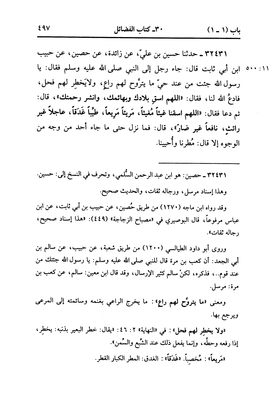 32431- حَدَّثَنَا حُسَيْنُ بْنُ عَلِيٍّ ، عَنْ زَائِدَةَ ، عَنْ حُصَيْنٍ ، عَنْ حَبِيبِ بْنِ أَبِي ثَابِتٍ ، قَالَ : جَاءَ رَجُلٌ إلَى النَّبِيِّ صَلَّى الله عَلَيْهِ وَسَلَّمَ ، فَقَالَ : يَا رَسُولَ اللهِ , جِئْتُ مِنْ عِنْدِ حَيٍّ مَا يَتَرَوَّحُ لَهُمْ رَاعٍ , وَلاَ يَخْطِرُ لَهُمْ فَحْلٌ فَادْعُ اللَّهَ لَنَا ، فَقَالَ : اللَّهُمَّ اسْقِ بِلاَدَك وَبَهَائِمَك وَانْشُرْ رَحْمَتَكَ ، قَالَ : ثُمَّ دَعَا فَقَالَ : اللَّهُمَّ اسْقِنَا غَيْثًا مُغِيثًا ، مَرِيئًا مَرِيعًا ، طَيِّبًا غَدَقًا ، عَاجِلاً غَيْرَ رَائِثٍ ، نَافِعًا غَيْرَ ضَارٍّ ، قَالَ : فَمَا نَزَلَ حَتَّى مَا جَاءَ أَحَدٌ مِنْ وَجْهٍ مِنَ الْوُجُوهِ إلاَّ قَالَ : مُطِرْنَا وَأُحْيِينَا. (11/499).