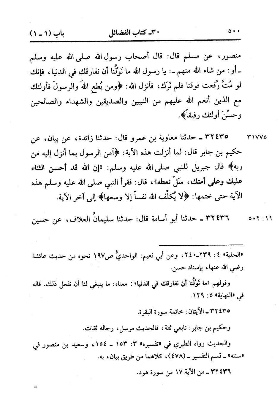 32435- حَدَّثَنَا مُعَاوِيَةُ بْنُ عَمْرٍو , قَالَ : حدَّثَنَا زَائِدَةُ ، عَنْ بَيَانٍ ، عَنْ حَكِيمِ بْنِ جَابِرٍ ، قَالَ : لَمَّا أنْزِلَتْ هَذِهِ الآيَةُ {آمَنَ الرَّسُولُ بِمَا أُنْزِلَ إلَيْهِ مِنْ رَبِّه} ، قَالَ جِبْرِيلُ لِلنَّبِيِّ صَلَّى الله عَلَيْهِ وَسَلَّمَ : إنَّ اللَّهَ قَدْ أَحْسَنَ الثَّنَاءَ عَلَيْك وَعَلَى أُمَّتِكَ , سَلْ تُعْطَهُ ، قَالَ : فَقَرَأَ النَّبِيُّ صَلَّى الله عَلَيْهِ وَسَلَّمَ هَذِهِ الآيَةَ حَتَّى خَتَمَهَا : {لاَ يُكَلِّفُ اللَّهُ نَفْسًا إلاَّ وُسْعَهَا} إلَى آخِرِ الآيَةِ. (11/501).
