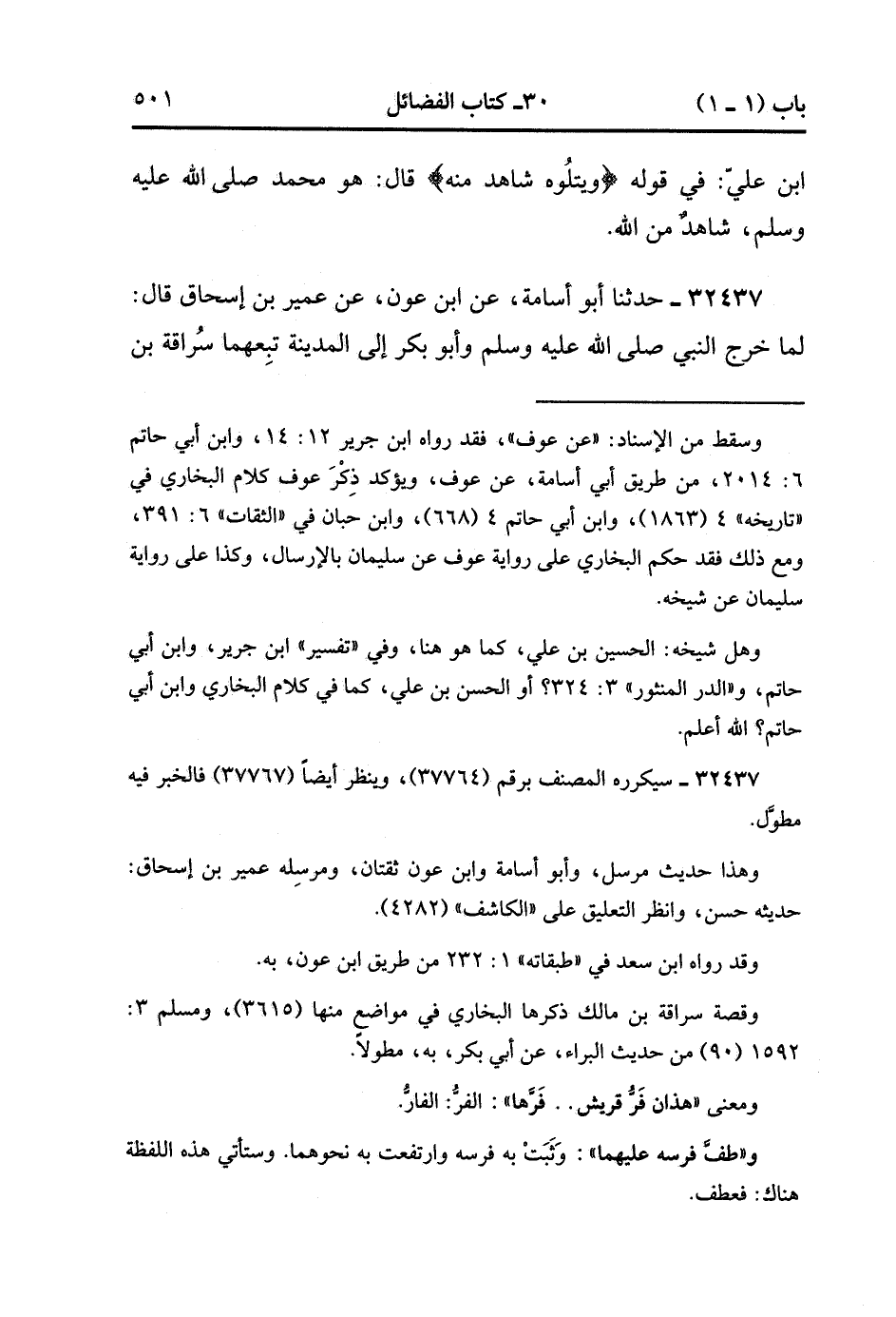 32437- حَدَّثَنَا أَبُو أُسَامَةَ ، عَنِ ابْنِ عَوْنٍ ، عَنْ عُمَيْرِ بْنِ إِسْحَاقَ ، قَالَ : لَمَّا خَرَجَ النَّبِيُّ صَلَّى الله عَلَيْهِ وَسَلَّمَ وَأَبُو بَكْرٍ إلَى الْمَدِينَةِ ، تَبِعَهُمَا سُرَاقَةُ بْنُ مَالِكٍ ، فَلَمَّا رَآهُمَا قَالَ : هَذَانِ فَرُّ قُرَيْشٍ لَوْ رَدَدْت عَلَى قُرَيْشٍ فَرَّهَا ، قَالَ : فَطَفَّ فَرَسُهُ عَلَيْهِمَا ، قَالَ : فَسَاخَتِ الْفَرَسُ ، قَالَ : فَادْعُ اللَّهَ أَنْ يُخْرِجَهَا ، وَلاَ أَقْرَبُكُمَا ، قَالَ : فَخَرَجَتْ فَعَادَتْ حَتَّى فَعَلَ ذَلِكَ مَرَّتَيْنِ ، أَوْ ثَلاَثًا ، قَالَ : تَبًّا وتَعْسًا ، ثُمَّ قَالَ : هَلْ لَك إلاَّ الزَّادُ وَالْحُمْلاَنِ ؟ قَالاَ : لاَ نُرِيدُ ، وَلاَ حَاجَةَ لَنَا فِي ذَلِكَ ، أَغْنِ عَنَّا نَفْسَك ، قَالَ : كَفَيْتُكُمَا. (11/502).