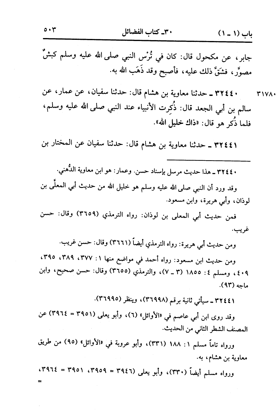 32440- حَدَّثَنَا مُعَاوِيَةُ بْنُ هِشَامٍ , قَالَ : حدَّثَنَا سُفْيَانُ ، عَنْ عَمَّارٍ ، عَنْ سَالِمِ بْنِ أَبِي الْجَعْدِ ، قَالَ : ذُكِرَتِ الأَنْبِيَاءُ عِنْدَ النَّبِيِّ صَلَّى الله عَلَيْهِ وَسَلَّمَ ، فَلَمَاْ ذُكِرَ هُو َقَالَ : ذَاكَ خَلِيلُ اللهِ.