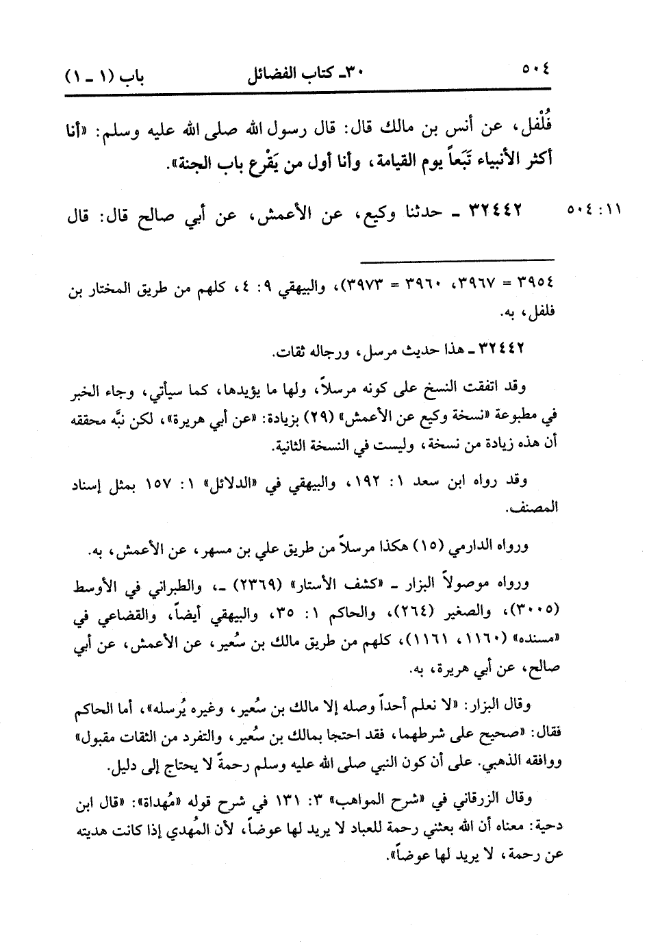 32442- حَدَّثَنَا وَكِيعٌ ، عَنِ الأَعْمَشِ ، عَنْ أَبِي صَالِحٍ ، قَالَ : قَالَ رَسُولُ اللهِ صَلَّى الله عَلَيْهِ وَسَلَّمَ : أيهَا النَّاسُ إنَّمَا أَنَا رَحْمَةٌ مُهْدَاةٌ. (11/504).