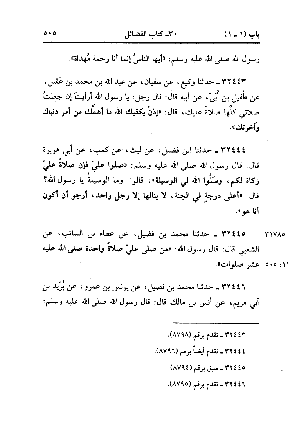 32446- حَدَّثَنَا مُحَمَّدُ بْنُ فُضَيْلٍ ، عَنْ يُونُسَ بْنِ عَمْرٍو ، عَنْ بُرَيْدِ بْنِ أَبِي مَرْيَمَ ، عْن أَنَسِ بْنِ مَالِكٍ ، قَالَ : قَالَ رَسُولُ اللهِ صَلَّى الله عَلَيْهِ وَسَلَّمَ : مَنْ صَلَّى عَلَيَّ صَلاَةً وَاحِدَةً صَلَّى اللَّهُ عَلَيْهِ عَشْرَ صَلَوَاتٍ ، وَحَطَّ عَنْهُ عَشْرَ سَيِّئَاتٍ. (11/505).