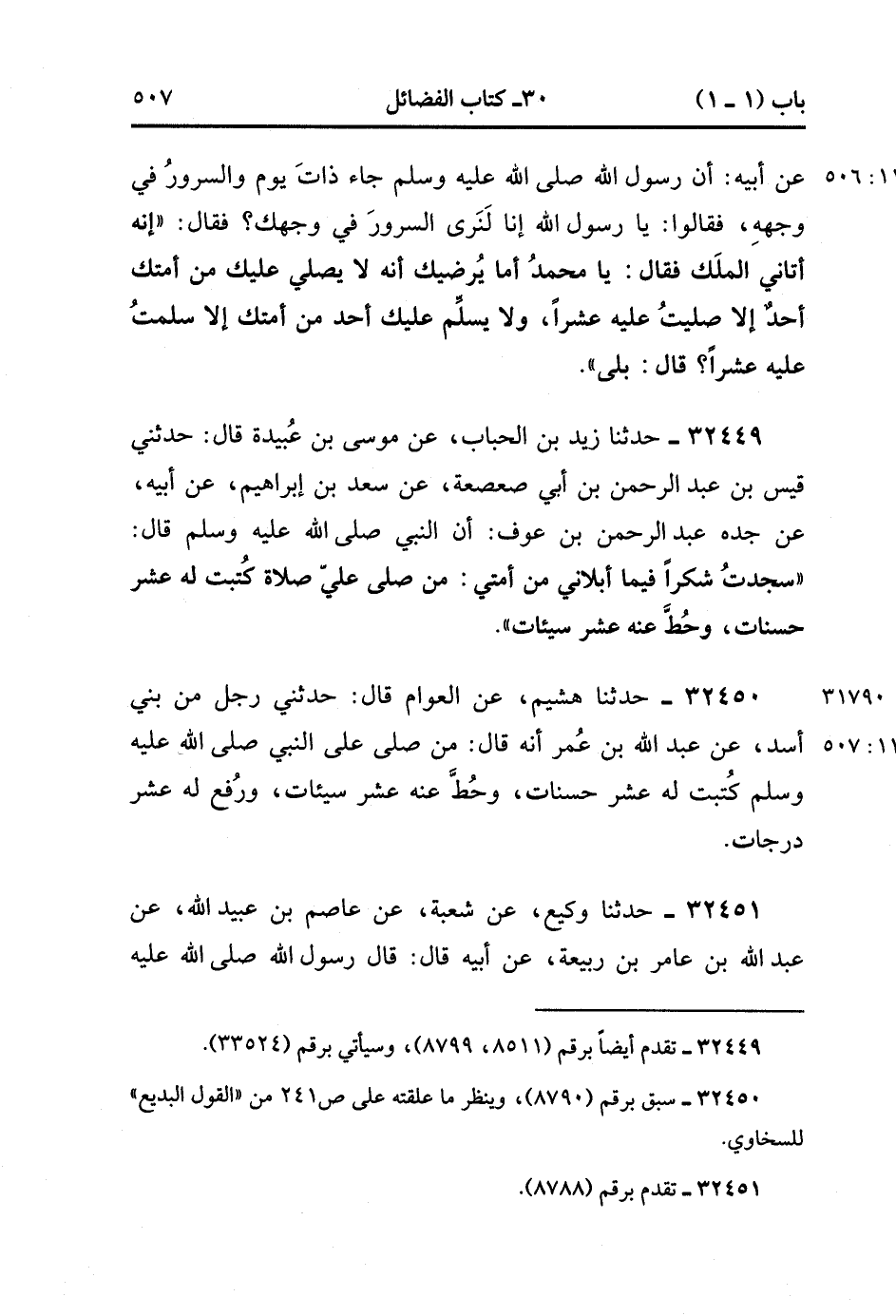 32449- حَدَّثَنَا زَيْدُ بْنُ الْحُبَابِ ، عَنْ مُوسَى بْنِ عُبَيْدَةَ ، قَالَ : حدَّثَنِي قَيْسُ بْنُ عَبْدِ الرَّحْمَنِ بْنِ أَبِي صَعْصَعَةَ ، عَنْ سَعْدِ بْنِ إِبْرَاهِيمَ ، عَنْ أَبِيهِ ، عَنْ جَدِّهِ عَبْدِ الرَّحْمَنِ بْنِ عَوْفٍ ؛ أَنَّ النَّبِيَّ صَلَّى الله عَلَيْهِ وَسَلَّمَ قَالَ : سَجَدْت شُكْرًا فِيمَا أَبْلاَنِي مِنْ أُمَّتِي : مَنْ صَلَّى عَلَيَّ صَلاَةً كُتِبَتْ لَهُ عَشْرُ حَسَنَاتٍ ، وَحُطَّ عَنْهُ عَشْرُ سَيِّئَاتٍ. (11/506).