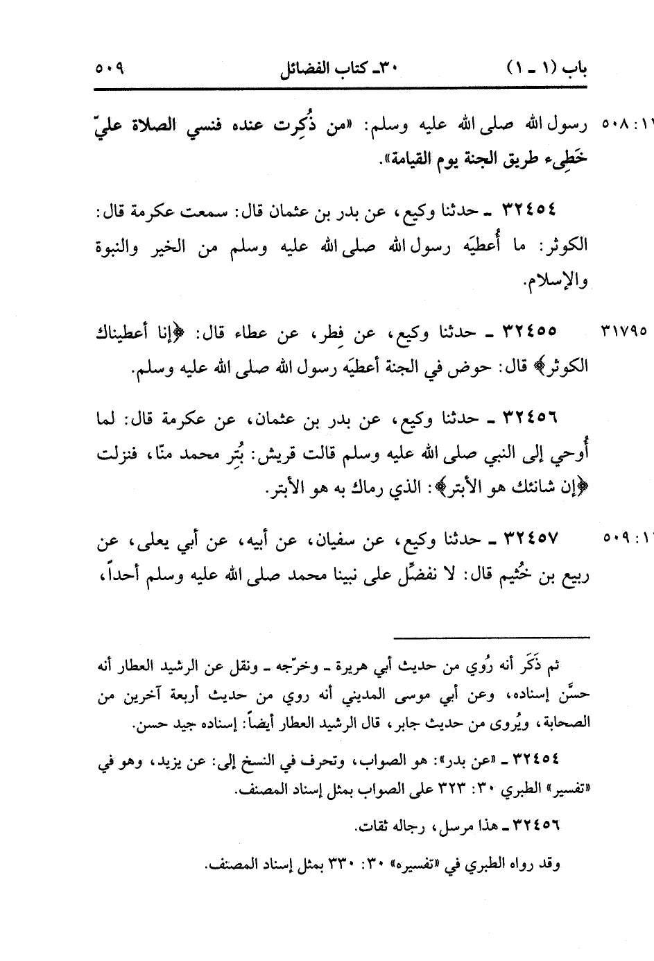 32456- حَدَّثَنَا وَكِيعٌ ، عَنْ بَدْرِ بْنِ عُثْمَانَ ، عَنْ عِكْرِمَةَ ، قَالَ : لَمَّا أُوحِيَ إلَى النَّبِيِّ صَلَّى الله عَلَيْهِ وَسَلَّمَ ، قَالَتْ قُرَيْشٌ : بُتِرَ مُحَمَّدٌ مِنَّا , فَنَزَلَتْ : {إنَّ شَانِئَك هُوَ الأَبْتَرُ} : الَّذِي رَمَاك بِهِ هُوَ الأَبْتَرُ. (11/508).