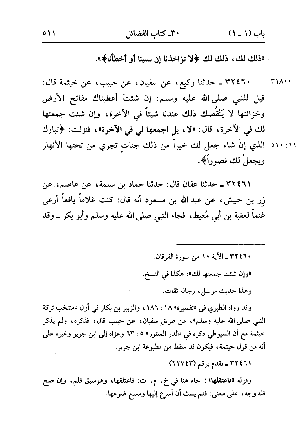 32460- حَدَّثَنَا وَكِيعٌ ، عَنْ سُفْيَانَ ، عَنْ حَبِيبٍ ، عَنْ خَيْثَمَةَ ، قَالَ : قيلَ لِلنَّبِيِّ صَلَّى الله عَلَيْهِ وَسَلَّمَ : إنْ شِئْت أَعْطَيْنَاك مَفَاتِحَ الأَرْضِ وَخَزَائِنَهَا , لاَ يَنْقُصُك ذَلِكَ عِنْدَنَا شَيْئًا فِي الآخِرَةِ , وَإِنْ شِئْت جَمَعْتُهَا لَك فِي الآخِرَةِ ، قَالَ : لاَ , بَلَ اجْمَعْهَا لِي فِي الآخِرَةِ , فَنَزَلَتْ : {تَبَارَكَ الَّذِي إنْ شَاءَ جَعَلَ لَك خَيْرًا مِنْ ذَلِكَ جَنَّاتٍ تَجْرِي مِنْ تَحْتِهَا الأَنْهَارُ وَيَجْعَلْ لَك قُصُورًا}.(11/509).
