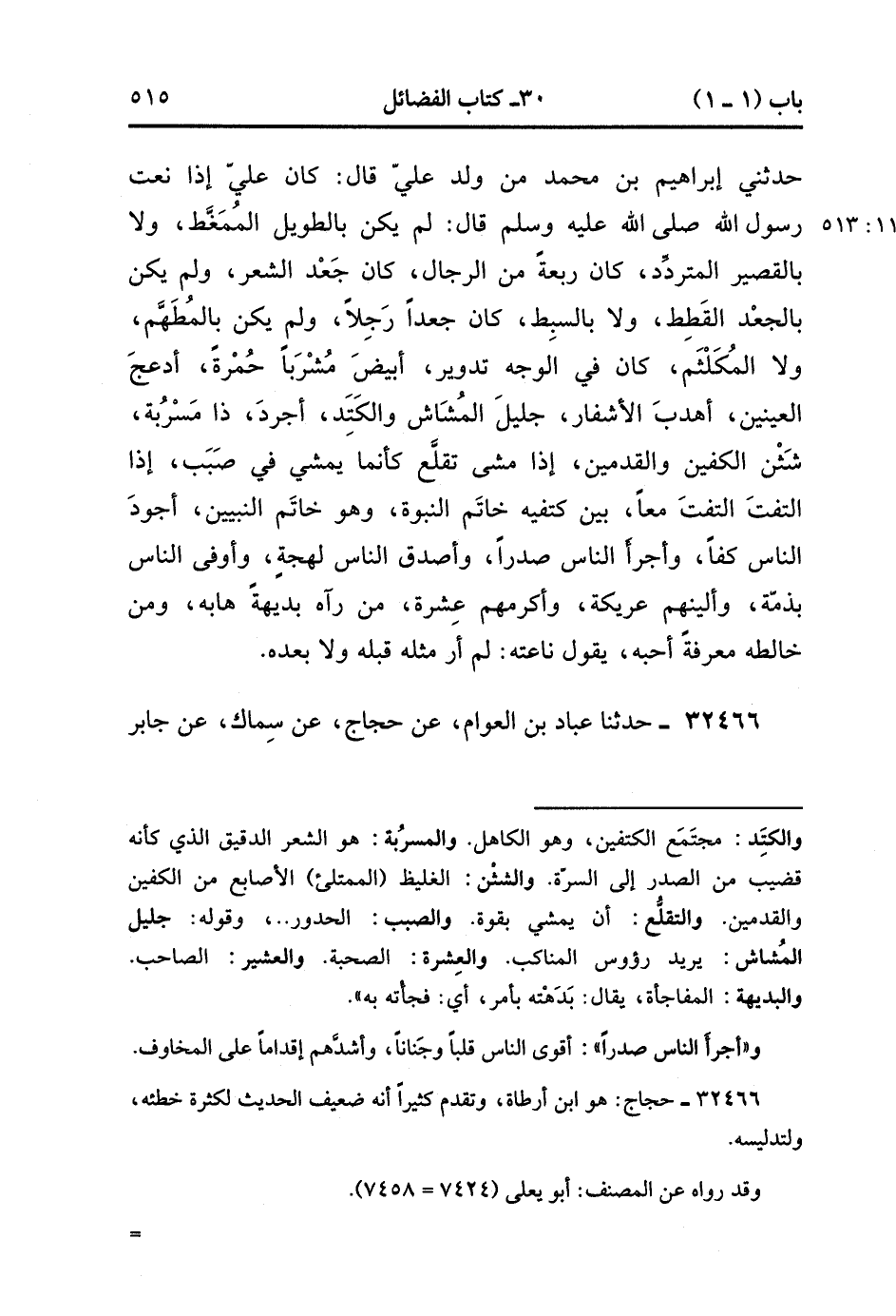 32466- حَدَّثَنَا عَبَّادُ بْنُ الْعَوَّامِ ، عَنْ حَجَّاجٍ ، عَنْ سِمَاكٍ ، عَنْ جَابِرِ بْنِ سَمُرَةَ ، قَالَ : كَانَتْ فِي سَاقَيْ رَسُولِ اللهِ صَلَّى الله عَلَيْهِ وَسَلَّمَ حُمُوشَةٌ , وَكَانَ لاَ يَضْحَكُ إلاَّ تَبَسُّمًا , وَكُنْت إذَا نَظَرْت قُلْتُ : أَكْحَلَ الْعَيْنَيْنِ وَلَيْسَ بِأَكْحَلَ. (11/513).