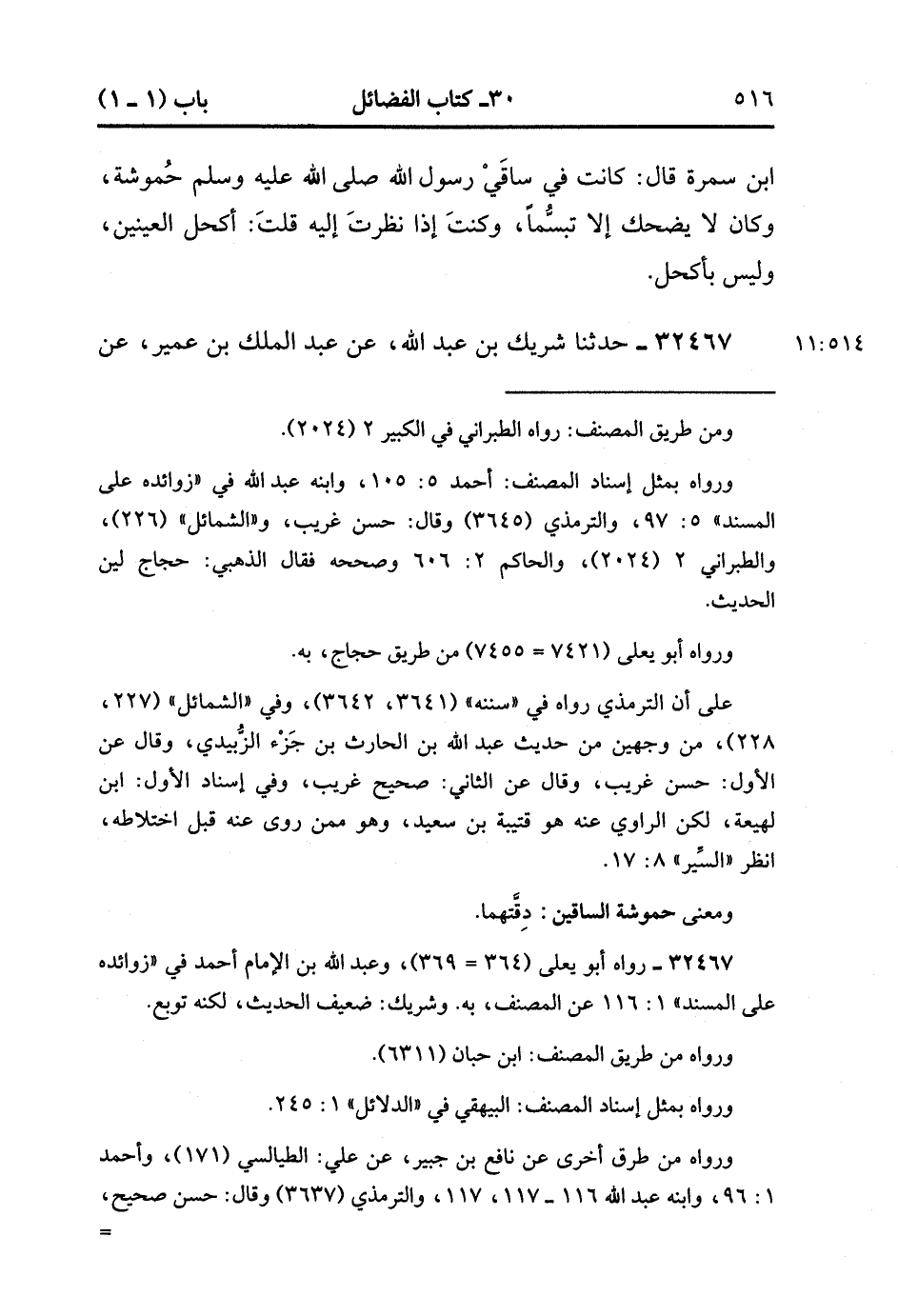32467- حَدَّثَنَا شَرِيكُ بْنُ عَبْدِ اللهِ ، عَنْ عَبْدِ الْمَلِكِ بْنِ عُمَيْرٍ ، عَنْ نَافِعِ بْنِ جُبَيْرٍ ، عَنْ عَلِيٍّ ؛ أَنَّهُ وَصَفَ النَّبِيَّ صَلَّى الله عَلَيْهِ وَسَلَّمَ : كَانَ عَظِيمَ الْهَامَةِ ، أَبْيَضَ مُشْرَبًا حُمْرَةً ، عَظِيمَ اللِّحْيَةِ ضَخْمَ الْكَرَادِيسِ , شَثْنَ الْكَفَّيْنِ وَالْقَدَمَيْنِ , طَوِيلَ الْمَسْرُبَةِ ، كَثِيرَ شَعْرِ الرَّأْسِ , رَجِلَه ، يَتَكَفَّأُ فِي مِشْيَتِهِ كَأَنَّمَا يَنْحَدِرُ فِي صَبَبٍ , لاَ طَوِيلٌ ، وَلاَ قَصِيرٌ , لَمْ أَرَ مِثْلَهُ قَبْلَهُ وَلاَ بَعْدَهُ. (11/514).