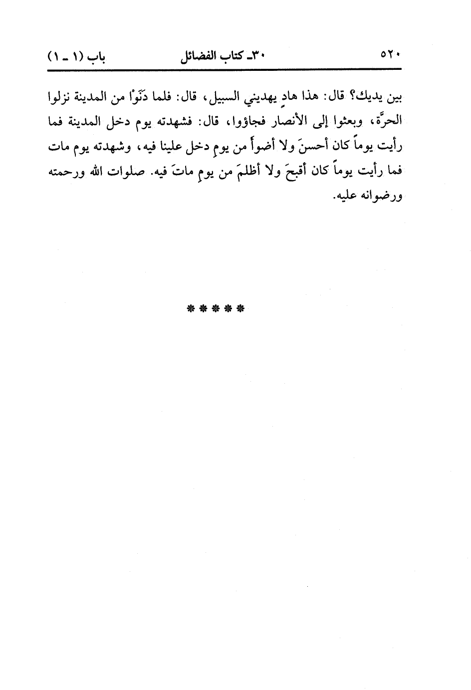 32472- حَدَّثَنَا عَفَّانُ , قَالَ : حدَّثَنَا حَمَّادُ بْنُ سَلَمَةَ , قَالَ : أَخْبَرَنَا ثَابِتٌ ، عَنْ أَنَسٍ ؛ أَنَّ أَبَا بَكْرٍ كَانَ رَدِيفَ النَّبِيُّ صَلَّى الله عَلَيْهِ وَسَلَّمَ مِنْ مَكَّةَ إلَى الْمَدِينَةِ , وَكَانَ أَبُو بَكْرٍ يَخْتَلِفُ إلَى الشَّامِ ، قَالَ : وَكَانَ يُعْرَفُ وَكَانَ النَّبِيُّ صَلَّى الله عَلَيْهِ وَسَلَّمَ لاَ يُعْرَفُ ، فَكَانُوا يَقُولُونَ : يَا أَبَا بَكْرٍ, مَنْ هَذَا الْغُلاَمُ بَيْنَ يَدَيْك ، قَالَ : هَذَا هَادٍ يَهْدِي السَّبِيلَ ، قَالَ : فَلَمَّا دَنَوَا مِنَ الْمَدِينَةِ نَزَلاَ الْحَرَّةَ ، وَبَعَثَوا إلَى الأَنْصَارِ فَجَاؤُوا ، قَالَ : فَشَهِدْتُهُ يَوْمَ دَخَلَ الْمَدِينَةَ فَمَا رَأَيْتُ يَوْمًا كَانَ أَحْسَنَ ، وَلاَ أَضْوَأَ مِنْ يَوْمٍ دَخَلَ عَلَيْنَا فِيهِ , وَشَهِدْتُهُ يَوْمَ مَاتَ فَمَا رَأَيْتُ يَوْمًا كَانَ أَقْبَحَ ، وَلاَ أَظْلَمَ مِنْ يَوْمٍ مَاتَ فِيهِ ، صَلَوَاتُ اللهِ وَرَحْمَتُهُ وَرِضْوَانُهُ عَلَيْهِ. (11/516).