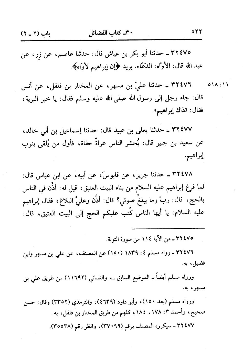 32475- حَدَّثَنَا أَبُو بَكْرِ بْنُ عَيَّاشٍ , قَالَ : حدَّثَنَا عَاصِمٌ ، عَنْ زِرٍّ ، عَنْ عَبْدِ اللهِ ، قَالَ : الأَوَّاهُ الدُّعَاءُ. يُرِيدُ {إنَّ إبْرَاهِيمَ لاَوَّاهٌ}.(11/517).