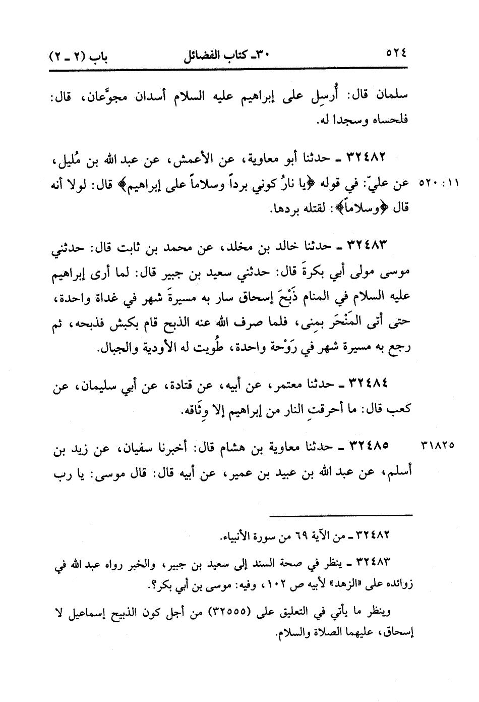 32482- حَدَّثَنَا أَبُو مُعَاوِيَةَ ، عَنِ الأَعْمَشِ ، عَنْ عَبْدِ اللهِ بْنِ مُليلٍ ، عَنْ عَلِيٍّ : فِي قَوْلِهِ : {يَا نَارُ كُونِي بَرْدًا وَسَلاَمًا عَلَى إبْرَاهِيمَ} قَالَ : لَوْلا أَنَّهُ قَالَ {وَسَلاَمًا} لَقَتَلَهُ بَرْدُهَا. (11/519).