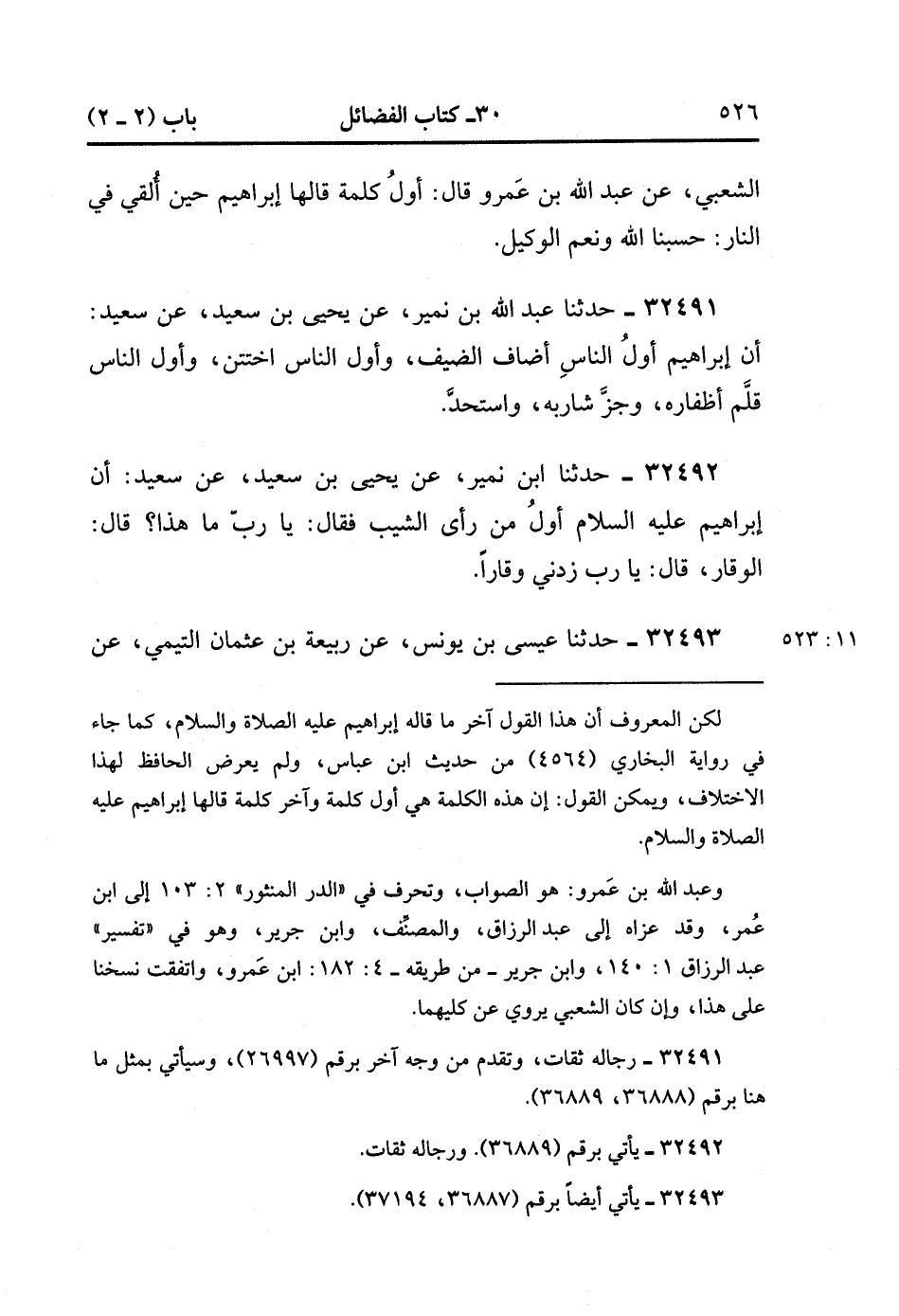 32490- حَدَّثَنَا الْفَضْلُ بْنُ دُكَيْنٍ ، عَنْ سُفْيَانَ ، عَنْ فِرَاسٍ ، عَنِ الشَّعْبِيِّ ، عَنْ عَبْدِ اللهِ بْنِ عَمْرٍو ، قَالَ : أَوَّلُ كَلِمَةٍ قَالَهَا إبْرَاهِيمُ حِينَ أُلْقِيَ فِي النَّارِ : حَسْبُنَا اللَّهُ وَنِعْمَ الْوَكِيلُ.
