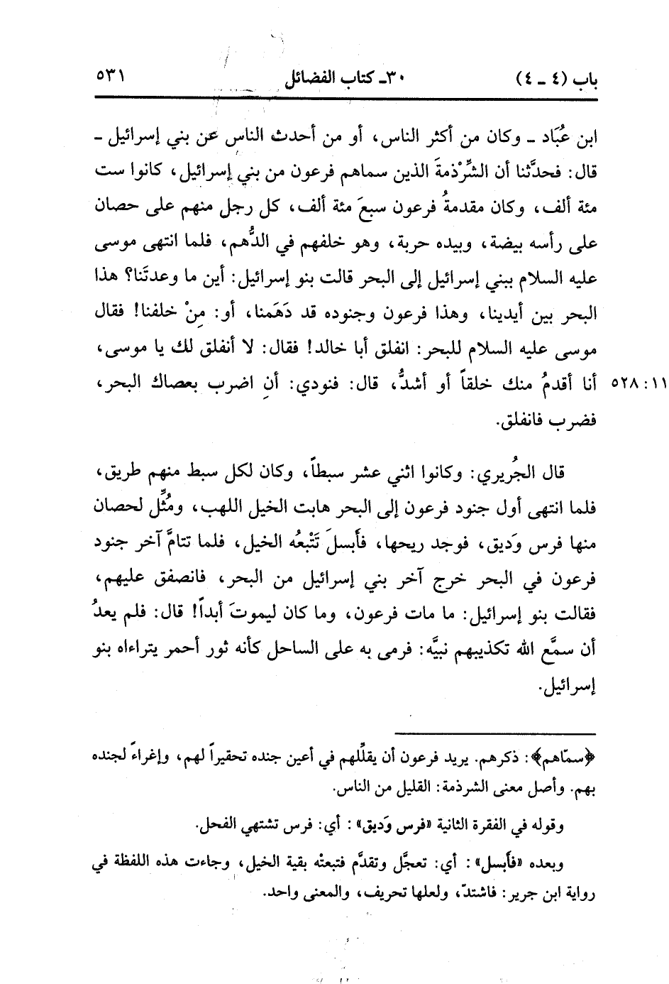 قَالَ الْجُرَيْرِيُّ : وَكَانُوا اثْنَيْ عَشَرَ سِبْطًا , وَكَانَ لِكُلِّ سِبْطٍ مِنْهُمْ طَرِيقٌ ، فَلَمَّا انْتَهَى أَوَّلُ جُنُودِ فِرْعَوْنَ إلَى الْبَحْرِ هَابَتِ الْخَيْلُ اللهب , وَمُثِّلَ لِحِصَانٍ مِنْهَا فَرَسٌ وَدِيقٌ , فَوَجَدَ رِيحَهَا ، فَأبسلَ تَتْبَعُهُ الْخَيْلُ ، فَلَمَّا تَتَامَّ آخِرُ جُنُودِ فِرْعَوْنَ فِي الْبَحْرِ خَرَجَ آخِرُ بَنِي إسْرَائِيلَ مِنَ الْبَحْرِ فَانْصَفَقَ عَلَيْهِمْ ، فَقَالَتْ بَنُو إسْرَائِيلَ : مَا مَاتَ فِرْعَوْنُ ، وَمَا كَانَ لِيَمُوتَ أَبَدًا ، قَالَ : فَلَمْ يَعُدُ أَنْ سَمَّعَ اللَّهُ تَكْذِيبَهُمْ نَبِيَّهُ , فَرَمَى بِهِ عَلَى السَّاحِلِ كَأَنَّهُ ثَوْرٌ أَحْمَرُ يَتَرَاءاهُ بَنُو إسْرَائِيلَ. (11/528).