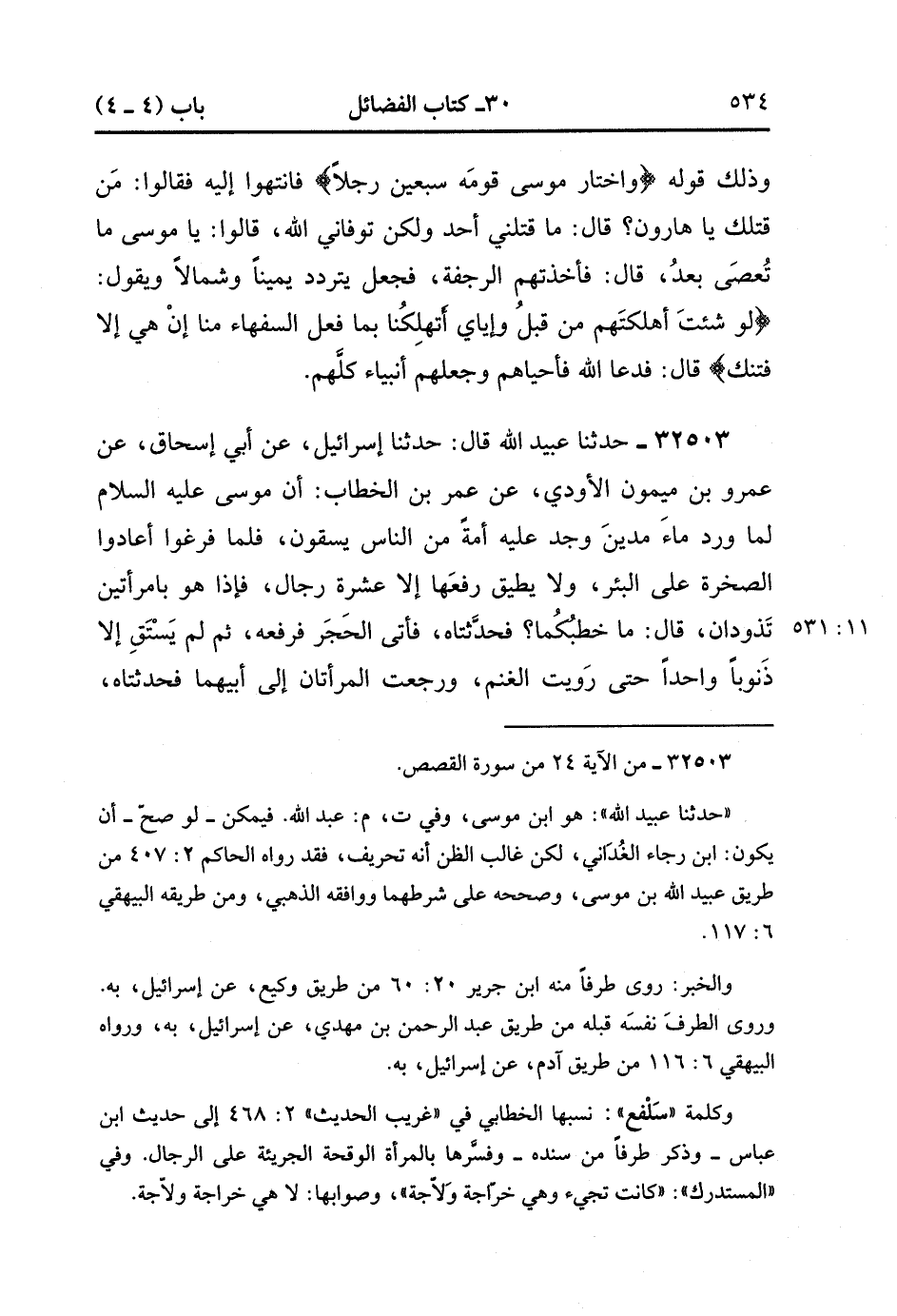 32503- حَدَّثَنَا عُبَيْدُ اللهِ , قَالَ : حدَّثَنَا إسْرَائِيلُ ، عَنْ أَبِي إِسْحَاقَ ، عَنْ عَمْرِو بْنِ مَيْمُونٍ الأَوْدِيِّ ، عَنْ عُمَرَ بْنِ الْخَطَّابِ ، أَنَّ مُوسَى عَلَيْهِ السَّلاَمُ لَمَّا وَرَدَ مَاءَ مَدْيَنَ وَجَدَ عَلَيْهِ أُمَّةً مِنَ النَّاسِ يَسْقُونَ ، فَلَمَّا فَرَغُوا أَعَادُوا الصَّخْرَةَ عَلَى الْبِئْرِ ، وَلاَ يُطِيقُ رَفْعَهَا إلاَّ عَشْرَةُ رِجَالٍ , فَإِذَا هُوَ بِامْرَأَتَيْنِ تَذُودَانِ ،(11/530) قَالَ : مَا خَطْبُكُمَا فَحَدَّثَتَاهُ فَأَتَى الْحَجَرَ فَرَفَعَهُ ، ثُمَّ لَمْ يَسْتَقِ إلاَّ ذَنُوبًا وَاحِدًا حَتَّى رُوِيَتِ الْغَنَمُ وَرَجَعَتِ الْمَرْأَتَانِ إلَى أَبِيهِمَا فَحَدَّثَتَاهُ , وَتَوَلَّى مُوسَى عَلَيْهِ السَّلاَمُ إلَى الظِّلِّ ، فَقَالَ : {رَبِّ إنِّي لِمَا أَنْزَلْتَ إلَيَّ مِنْ خَيْرٍ فَقِيرٌ}.