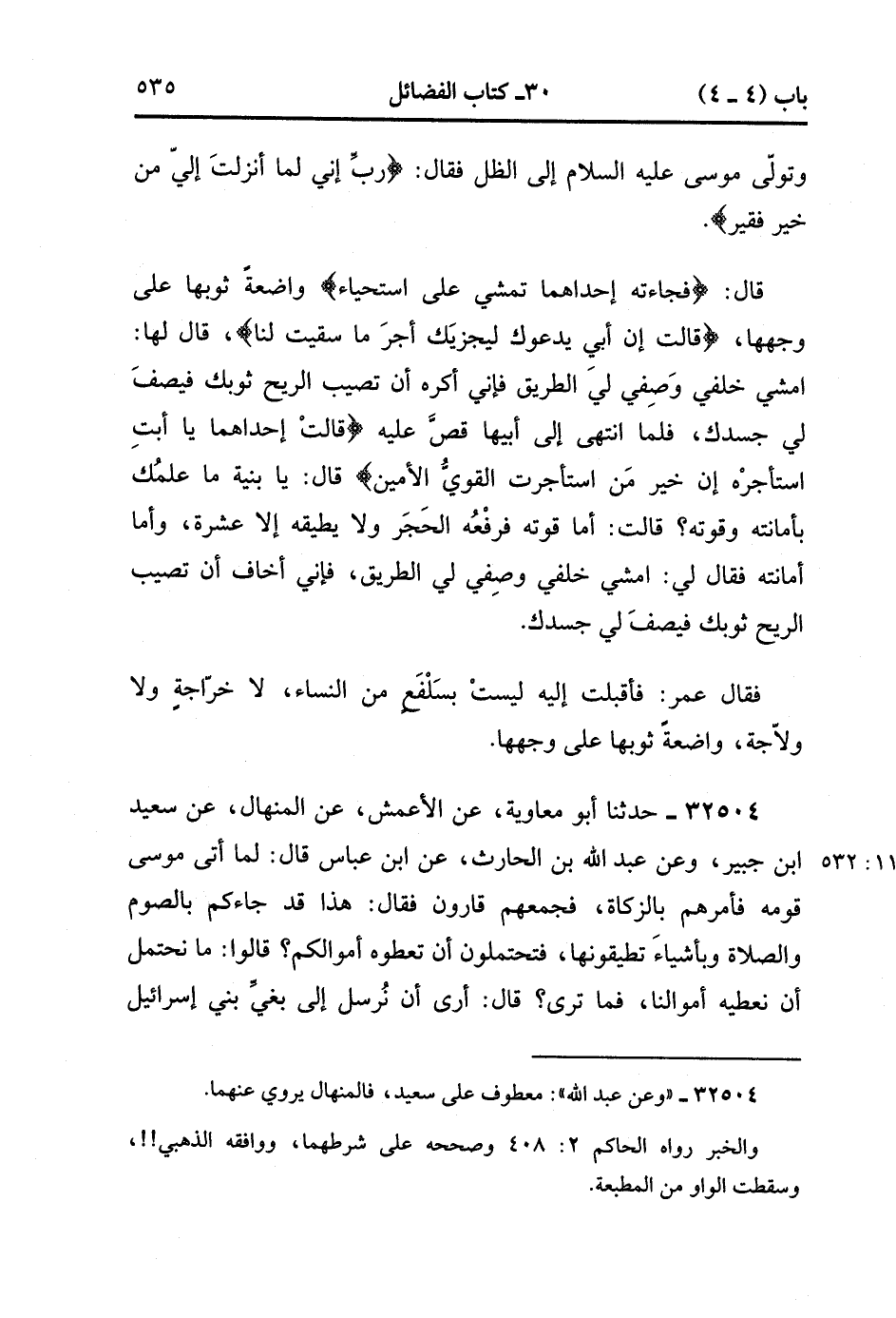 32504- حَدَّثَنَا أَبُو مُعَاوِيَةَ ، عَنِ الأَعْمَشِ ، عَنِ الْمِنْهَالِ ، عَنْ سَعِيدِ بْنِ جُبَيْرٍ ، وَعَنْ عَبْدِ اللهِ بْنِ الْحَارِثِ ، عَنِ ابْنِ عَبَّاسٍ ، قَالَ : لَمَّا أَتَى(11/531) مُوسَى قَوْمَهُ فَأَمَرَهُمْ بِالزَّكَاةِ , فَجَمَعَهُمْ قَارُونُ ، فَقَالَ : هَذَا قَدْ جَاءَكُمْ بِالصَّوْمِ وَالصَّلاَةِ وَبِأَشْيَاءَ تُطِيقُونَهَا , فَتَحْتَمِلُونَ أَنْ تُعْطُوهُ أَمْوَالَكُمْ ؟ قَالُوا : مَا نَحْتَمِلُ أَنْ نُعْطِيَهُ أَمْوَالَنَا فَمَا تَرَى ؟ قَالَ : أَرَى أَنْ نُرْسِلَ إلَى بَغِيِّ بَنِي إسْرَائِيلَ فَنَأْمُرَهَا أَنْ تَرْمِيَهُ عَلَى رُؤُوسِ الأَحْبَارِ وَالنَّاسِ بِأَنَّهُ أَرَادَهَا عَلَى نَفْسِهَا , فَفَعَلُوا , فَرَمَتْ مُوسَى عَلَيْهِ السَّلاَمُ عَلَى رُؤُوسِ النَّاسِ ، فَدَعَا اللَّهَ عَلَيْهِمْ , فَأَوْحَى اللَّهُ تَعَالَى إلَى الأَرْضِ أَنْ أَطِيعِيهِ ، فَقَالَ لَهَا مُوسَى عَلَيْهِ السَّلاَمُ : خُذِيهِمْ , فَأَخَذَتْهُمْ إلَى أَعقَابهم فَجَعَلُوا يَقُولُونَ : يَا مُوسَى يَا مُوسَى فَقَالَ : خُذِيهِمْ , فَأَخَذَتْهُمْ إلَى رُكَبِهِمْ ، قَالَ : فَجَعَلُوا يَقُولُونَ : يَا مُوسَى يَا مُوسَى ، قَالَ : خُذِيهِمْ , فَأَخَذَتْهُمْ إلَى حُجَزِهِمْ , فَجَعَلُوا يَقُولُونَ يَا مُوسَى يَا مُوسَى ، قَالَ : خُذِيهِمْ , فَأَخَذَتْهُمْ إلَى أَعْنَاقِهِمْ ، فَجَعَلُوا يَقُولُونَ : يَا مُوسَى يَا مُوسَى ، قَالَ : فَأَخَذَتْهُمْ فَغَيَّبَتْهُمْ , فَأَوْحَى اللَّهُ تَعَالَى إلَى مُوسَى عَلَيْهِ السَّلاَمُ : يَا مُوسَى, سَأَلَك عِبَادِي وَتَضَرَّعُوا إلَيْك فَأَبَيْت أَنْ تُجِيبَهُمْ , أَمَا وَعِزَّتِي لَوْ إيَّايَ دَعَوْنِي لاَجَبْتُهُمْ. (11/532).