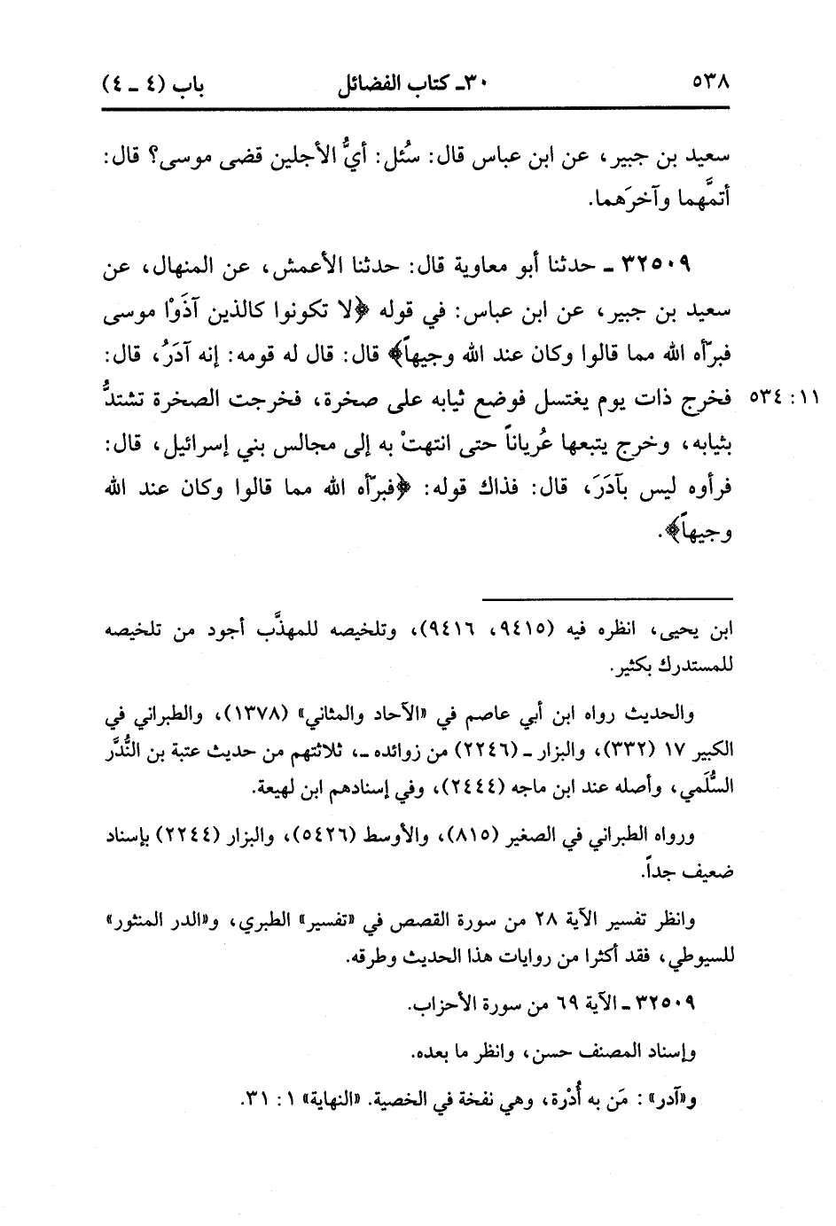 32509- حَدَّثَنَا أَبُو مُعَاوِيَةَ , قَالَ : حدَّثَنَا الأَعْمَشُ ، عَنِ الْمِنْهَالِ ، عَنْ سَعِيدِ بْنِ جُبَيْرٍ ، عَنِ ابْنِ عَبَّاسٍ : فِي قَوْلِهِ : {لاَ تَكُونُوا كَاَلَّذِينَ آذَوْا مُوسَى فَبَرَّأَهُ اللَّهُ مِمَا قَالُوا وَكَانَ عِنْدَ اللهِ وَجِيهًا} قَالَ : قَالَ لَهُ قَوْمُهُ : إِنَّهُ آدَرُ ، قَالَ : فَخَرَجَ(11/533) ذَاتَ يَوْمٍ يَغْتَسِلُ , فَوَضَعَ ثِيَابَهُ عَلَى صَخْرَةٍ ، فَخَرَجَتِ الصَّخْرَةُ تَشْتَدُّ بِثِيَابِهِ ، وَخَرَجَ يَتْبَعُهَا عُرْيَانًا حَتَّى انْتَهَتْ بِهِ إلَى مَجَالِسِ بَنِي إسْرَائِيلَ ، قَالَ : فَرَأَوْهُ لَيْسَ بِآدَرَ ، قَالَ : فَذَاكَ قَوْلُهُ {فَبَرَّأَهُ اللَّهُ مِمَا قَالُوا وَكَانَ عِنْدَ اللهِ وَجِيهًا}.(11/534).