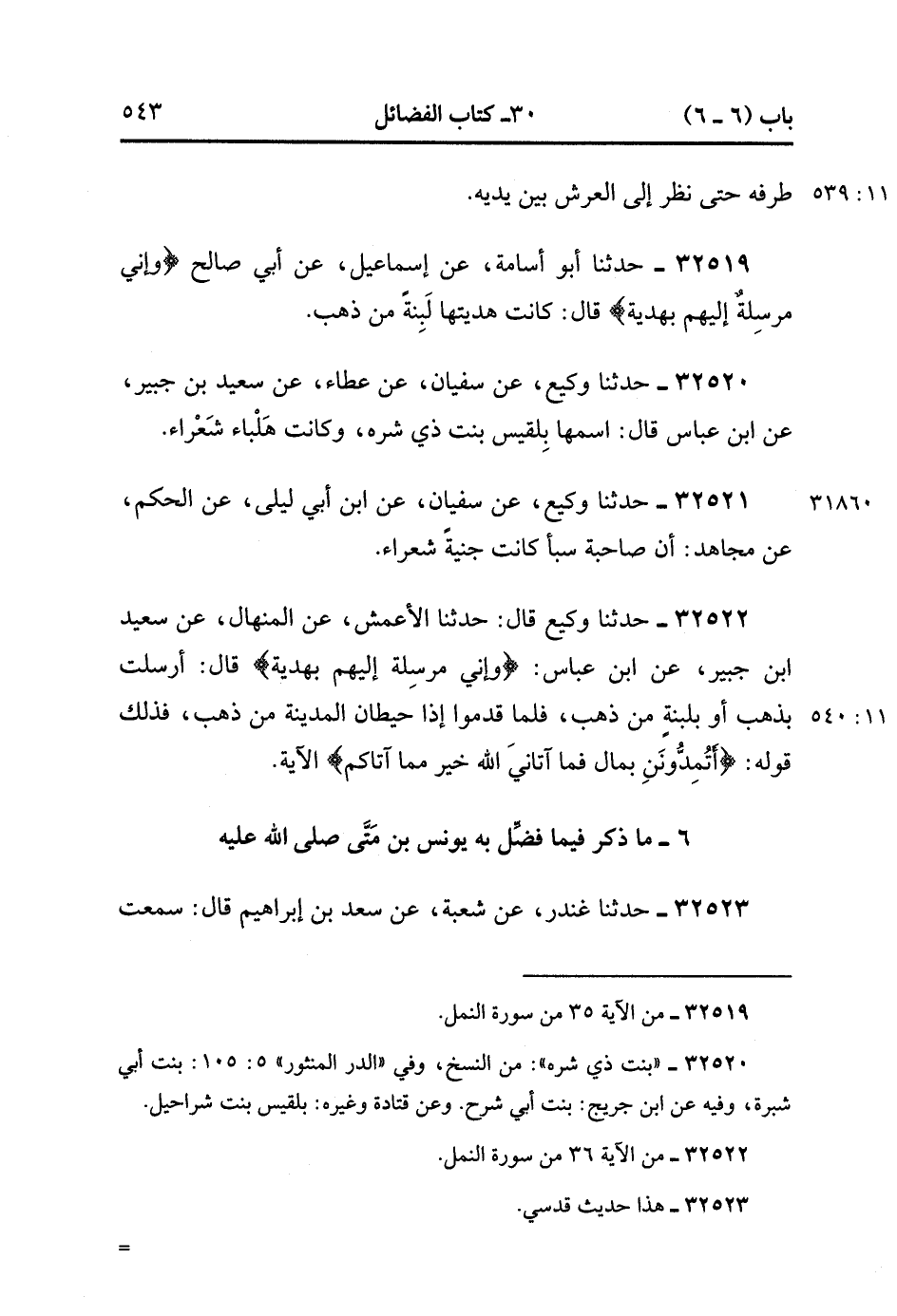32522- حَدَّثَنَا وَكِيعٌ , قَالَ : حدَّثَنَا الأَعْمَشُ ، عَنِ الْمِنْهَالِ ، عَنْ سَعِيدِ بْنِ جُبَيْرٍ ، عَنِ ابْنِ عَبَّاسٍ : {وَإِنِّي مُرْسِلَةٌ إلَيْهِمْ بِهَدِيَّةٍ} ، قَالَ : أَرْسَلَتْ بِذَهَبٍ ، أَوْ لَبِنَةٍ مِنْ ذَهَبٍ ، فَلَمَّا قَدِمُوا إذَا حِيطَانُ الْمَدِينَةِ مِنْ ذَهَبٍ , فَذَلِكَ قَوْلُهُ : {أَتُمِدُّونَنِي بِمَالٍ فَمَا أَتَانِي اللَّهُ خَيْرٌ مِمَّا آتَاكُمْ} الآيَةَ. (11/539).