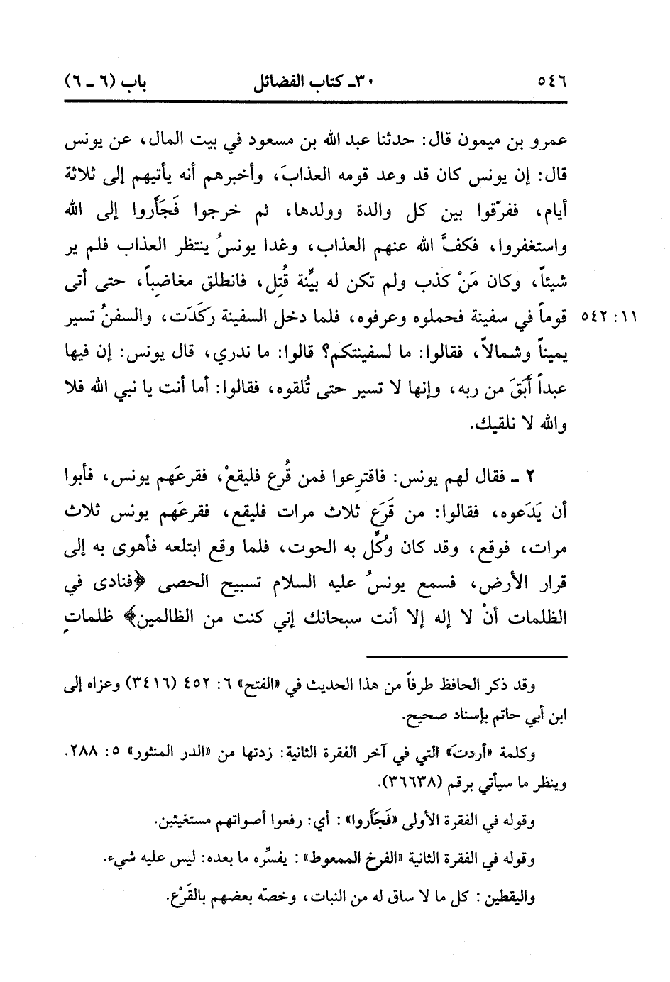 فَقَالَ لَهُمْ يُونُسُ : فَاقْتَرِعُوا فَمَنْ قُرِعَ فَلْيَقَعْ ، فَقَرَعَهُمْ يُونُسُ فَأَبَوْا أَنْ يَدَعُوهُ ، فَقَالُوا : مَنْ قَرَعَ ثَلاَثَ مَرَّاتٍ فَلْيَقَعْ , فَقَرَعَهُمْ يُونُسُ ثَلاَثَ مَرَّاتٍ فَوَقَعَ ، وَقَدْ كَانَ وُكِّلَ بِهِ الْحُوتُ ، فَلَمَّا وَقَعَ ابْتَلَعَهُ فَأَهْوَى بِهِ إلَى قَرَارِ الأَرْضِ , فَسَمِعَ يُونُسُ عَلَيْهَ السَلام تَسْبِيحَ الْحَصَى {فَنَادَى فِي الظُّلُمَاتِ أَنْ لاَ إلَهَ إلاَّ أَنْتَ سُبْحَانَك إنِّي كُنْت مِنْ ألظَّالِمِينَ} ظُلُمَاتٌ ثَلاَثٌ , ظُلْمَةُ بَطْنِ الْحُوتِ , وَظُلْمَةُ الْبَحْرِ , وَظُلْمَةُ اللَّيْلِ ، قَالَ : {فَنَبَذْنَاهُ بِالْعَرَاءِ وَهُوَ سَقِيمٌ} قَالَ : كَهَيْئَةِ الْفَرْخِ الْمَمْعُوطِ , لَيْسَ عَلَيْهِ رِيشٌ ، وَأَنْبَتَ اللَّهُ عَلَيْهِ شَجَرَةً مِنْ يَقْطِينٍ كَانَ يَسْتَظِلُّ بِهَا وَيُصِيبُ مِنْهَا , فَيَبِسَتْ فَبَكَى عَلَيْهَا حِينَ يَبِسَتْ , فَأَوْحَى اللَّهُ إلَيْهِ : تَبْكِي عَلَى شَجَرَةٍ يَبِسَتْ ، وَلاَ تَبْكِي عَلَى مِئَةِ أَلْفٍ أَوْ يَزِيدُونَ أَرَدْت أَنْ تُهْلِكَهُمْ. (11/542).