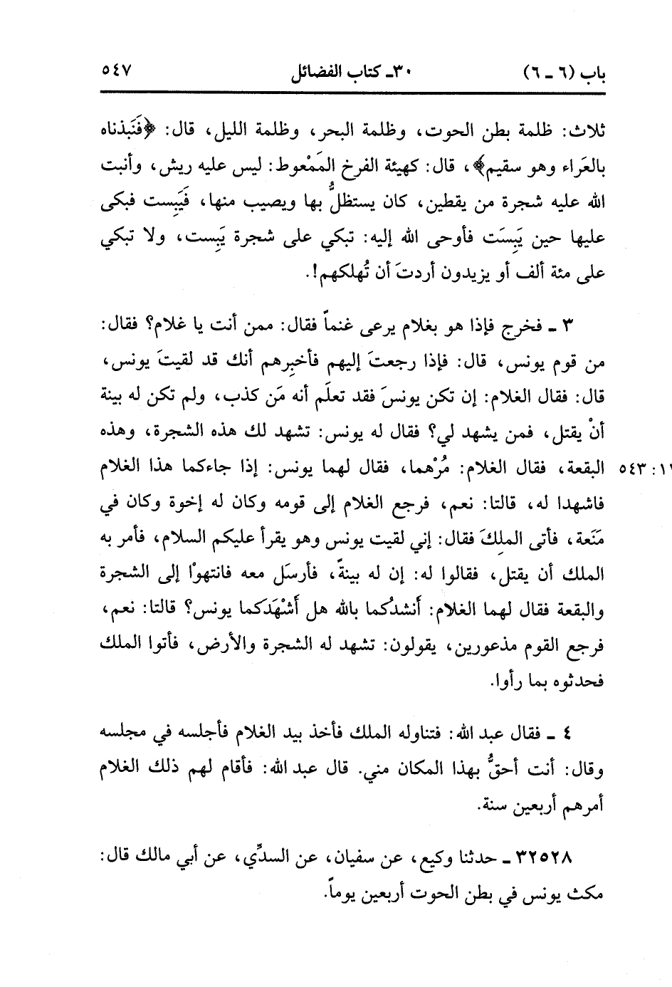 32528- حَدَّثَنَا وَكِيعٌ ، عَنْ سُفْيَانَ ، عَنِ السُّدِّيِّ ، عَنْ أَبِي مَالِكٍ ، قَالَ : مَكَثَ يُونُسُ فِي بَطْنِ الْحُوتِ أَرْبَعِينَ يَوْمًا. (11/543).