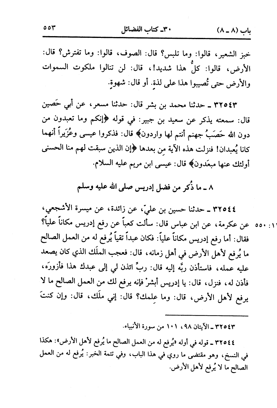32544- حَدَّثَنَا حُسَيْنُ بْنُ عَلِيٍّ ، عَنْ زَائِدَةَ ، عَنْ مَيْسَرَةَ الأَشْجَعِيِّ ، عَنْ عِكْرِمَةَ ، عَنِ ابْنِ عَبَّاسٍ ، قَالَ : سَأَلْتُ كَعْبًا عَنْ رَفْعِ إدْرِيسَ مَكَانًا عَلِيًّا ؟ فَقَالَ : (11/549) أَمَّا رَفْعُ إدْرِيسَ مَكَانًا عَلِيًّا ، فَكَانَ عَبْدًا تَقِيًّا , يُرْفَعُ لَهُ مِنَ الْعَمَلِ الصَّالِحِ مَا يُرْفَعُ لأَهْلِ الأَرْضِ فِي أَهْلِ زَمَانِهِ ، قَالَ : فَعَجِبَ الْمَلَكُ الَّذِي كَانَ يَصْعَدُ عَلَيْهِ عَمَلُهُ , فَاسْتَأْذَنَ رَبَّهُ إلَيْهِ ، قَالَ : رَبِّ ائْذَنْ لِي إلَى عَبْدِكَ هَذَا فَأَزُورَهُ ، فَأَذِنَ لَهُ ، فَنَزَلَ ، قَالَ : يَا إدْرِيسُ , أَبْشِرْ فَإِنَّهُ يُرْفَعُ لَك مِنَ الْعَمَلِ الصَّالِحِ مَا لاَ يُرْفَعُ لأَهْلِ الأَرْضِ ، قَالَ : وَمَا عِلْمُك ؟ قَالَ : إنِّي مَلَكٌ ، قَالَ : وَإِنْ كُنْت مَلَكًا ، قَالَ : فَإِنِّي عَلَى الْبَابِ الَّذِي يَصْعَدُ عَلَيْهِ عَمَلُكَ , (11/550)