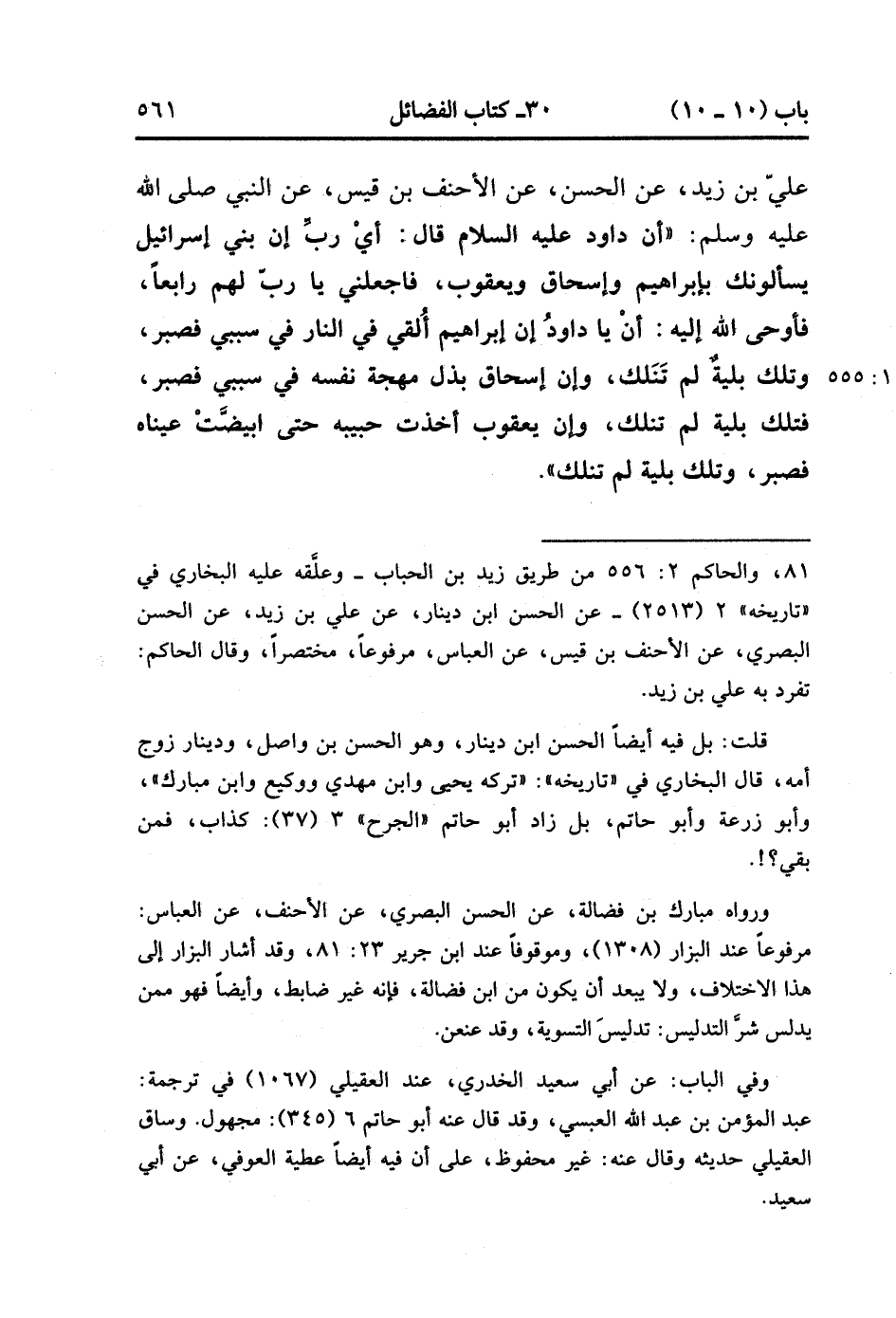 32555- حَدَّثَنَا عَفَّانُ , قَالَ : حدَّثَنَا حَمَّادُ بْنُ سَلَمَةَ ، قَالَ : حَدَّثَنَا عَلِيُّ بْنُ زَيْدٍ ، عَنِ الْحَسَنِ ، عَنِ الأَحْنَفِ بْنِ قَيْسٍ ، عَنِ النَّبِيِّ صَلَّى الله عَلَيْهِ وَسَلَّمَ ؛ أَنَّ دَاوُد عَلَيْهِ السَّلاَمُ ، قَالَ : أَيْ رَبِ , إنَّ بَنِي إسْرَائِيلَ يَسْأَلُونَك بِإِبْرَاهِيمَ وَإِسْحَاقَ وَيَعْقُوبَ فَاجْعَلْنِي يَا رَبِّ لَهُمْ رَابِعًا , فَأَوْحَى اللَّهُ إلَيْهِ : أَنْ يَا دَاوُد إنَّ إبْرَاهِيمَ أُلْقِيَ فِي النَّارِ فِي سَبَبِي فَصَبَرَ , وَتِلْكَ بَلِيَّةٌ لَمْ تَنَلْك ، وَإِنَّ إِسْحَاقَ بَذَلَ مهجة نَفْسَهُ فِي سَبَبِي فَصَبَرَ فَتِلْكَ بَلِيَّةٌ لَمْ تَنَلْك ، وَإِنَّ يَعْقُوبَ أَخَذْتَ حَبِيبَهُ حَتَّى ابْيَضَّتْ عَيْنَاهُ فَصَبَرَ وَتِلْكَ بَلِيَّةٌ لَمْ تَنَلْك. (11/554).