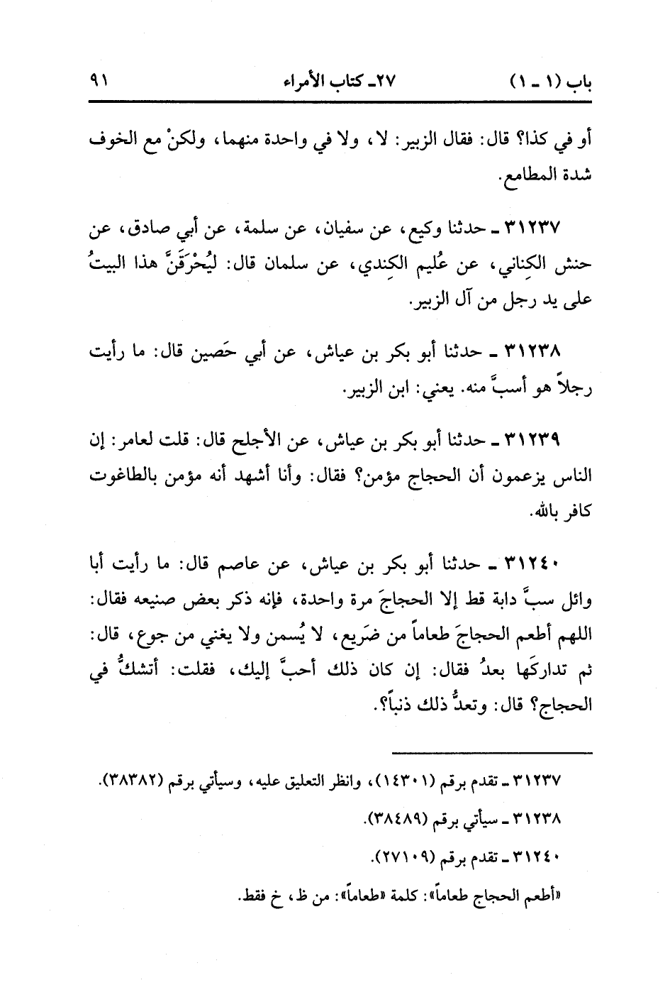 31239- حَدَّثَنَا أَبُو بَكْرِ بْنُ عَيَّاشٍ ، عَنِ الأَجْلَحِ ، قَالَ : قُلْتُ لِعَامِرٍ : إنَّ النَّاسَ يَزْعُمُونَ أَنَّ الْحَجَّاجَ مُؤْمِنٌ ؟ فَقَالَ : وَأَنَا أَشْهَدُ أَنَّهُ مُؤْمِنٌ بِالطَّاغُوتِ كَافِرٌ بِاللهِ.