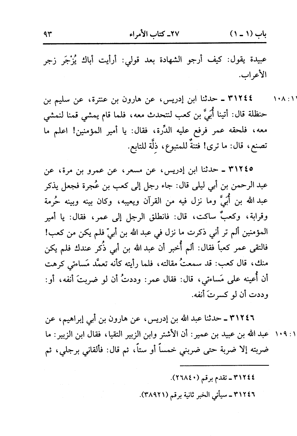 31244- حَدَّثَنَا ابْنُ إدْرِيسَ ، عَنْ هَارُونَ بْنِ عَنْتَرَةَ ، عَنْ سُلَيْمِ بْنِ حَنْظَلَةَ ، قَالَ : أَتَيْنَا أُبَيَّ بْنَ كَعْبٍ لِنَتَحَدَّثَ مَعَهُ ، فَلَمَّا قَامَ يَمْشِي قُمْنَا لِنَمْشِي مَعَهُ ، فَلَحِقَهُ عُمَرُ فَرَفَعَ عَلَيْهِ الدِّرَّةَ ، فَقَالَ : يَا أَمِيرَ الْمُؤْمِنِينَ : أَعْلَمُ مَا تَصْنَعُ ، قَالَ : مَا تَرَى فِتْنَةً لِلْمَتْبُوعِ ذِلَّةً لِلتَّابِعِ.(11/107).
