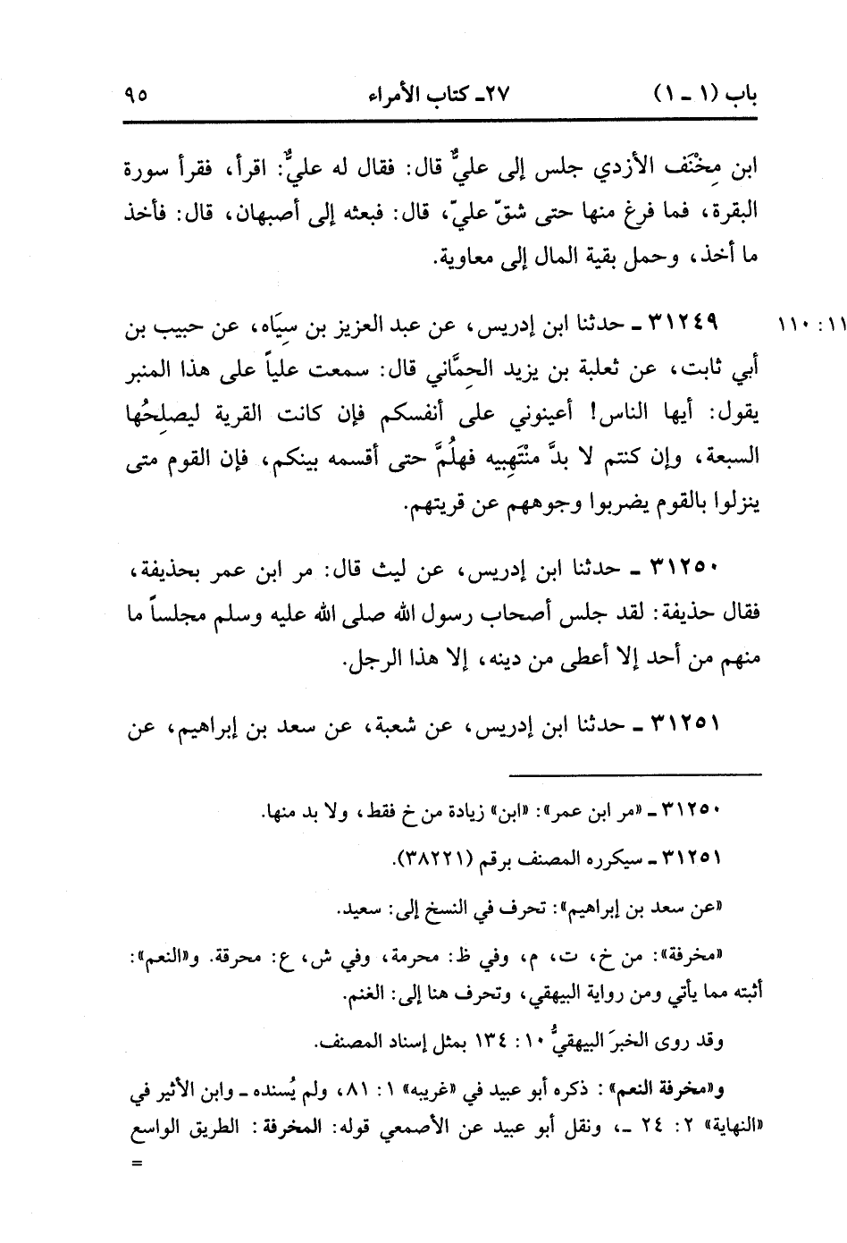 31251- حَدَّثَنَا ابْنُ إدْرِيسَ ، عَنْ شُعْبَةَ ، عَنْ سَعْدِ بْنِ إبْرَاهِيمَ ، عَنِ ابْنِ مِينَاءَ ، عَنِ الْمِسْوَرِ بْنِ مَخْرَمَةَ ، قَالَ : سَمِعْتُ عُمَرَ ، وَإِنَّ أَحَدَ أَصَابِعِي فِي جُرْحِهِ هَذِهِ أَوْ هُوَ يَقُولُ : يَا مَعْشَرَ قُرَيْشٍ ، إنِّي لاَ أَخَافُ النَّاسَ عَلَيْكُمْ ، إنَّمَا أَخَافُكُم عَلَى النَّاسِ ، وَإِنِّي قَدْ تَرَكْت فِيكُمَ اثْنَتَيْنِ لَمْ تَبْرَحُوا بِخَيْرٍ مَا لَزِمْتُمُوهَا : الْعَدْلَ فِي الْحُكْمِ ، وَالْعَدْلَ فِي الْقَسْمِ ، وَإِنِّي قَدْ تَرَكَتْكُمْ عَلَى مِثْلِ مَخْرَفَةِ الْنَعَمِ إلاَّ أَنْ يَعْوَجَّ قَوْمٌ فَيُعْوَجَّ بِهِمْ. (11/110).