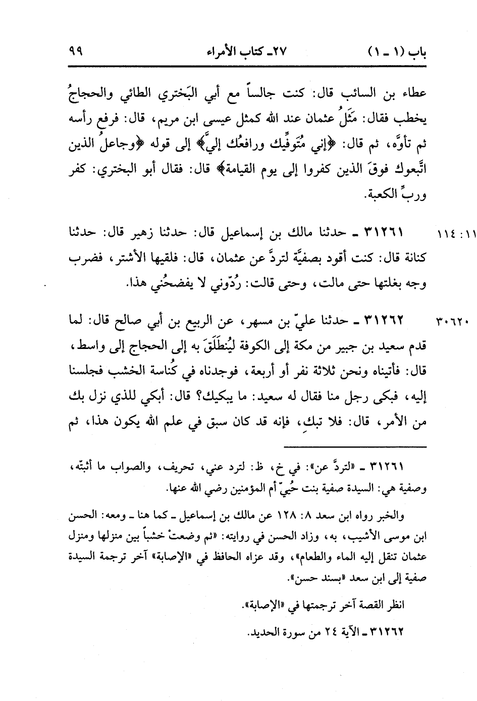 31261- حَدَّثَنَا مالك بن إسْمَاعِيلَ , قَالَ : حدَّثَنَا زُهَيْرٌ ، قَالَ : حَدَّثَنَا كِنَانَةٌ ، قَالَ : كُنْتُ أَقُودُ بِصَفِيَّةَ لِتَرُدَّ عَنْ عُثْمَانَ ، قَالَ : فَلَقِيَهَا الأَشْتَرُ فَضَرَبَ وَجْهَ بَغْلَتِِهَا حَتَّى مَالَتْ وَحَتَّى قَالَتْ : رُدُّونِي لاَ يَفْضَحُنِي هَذَا.(11/113).