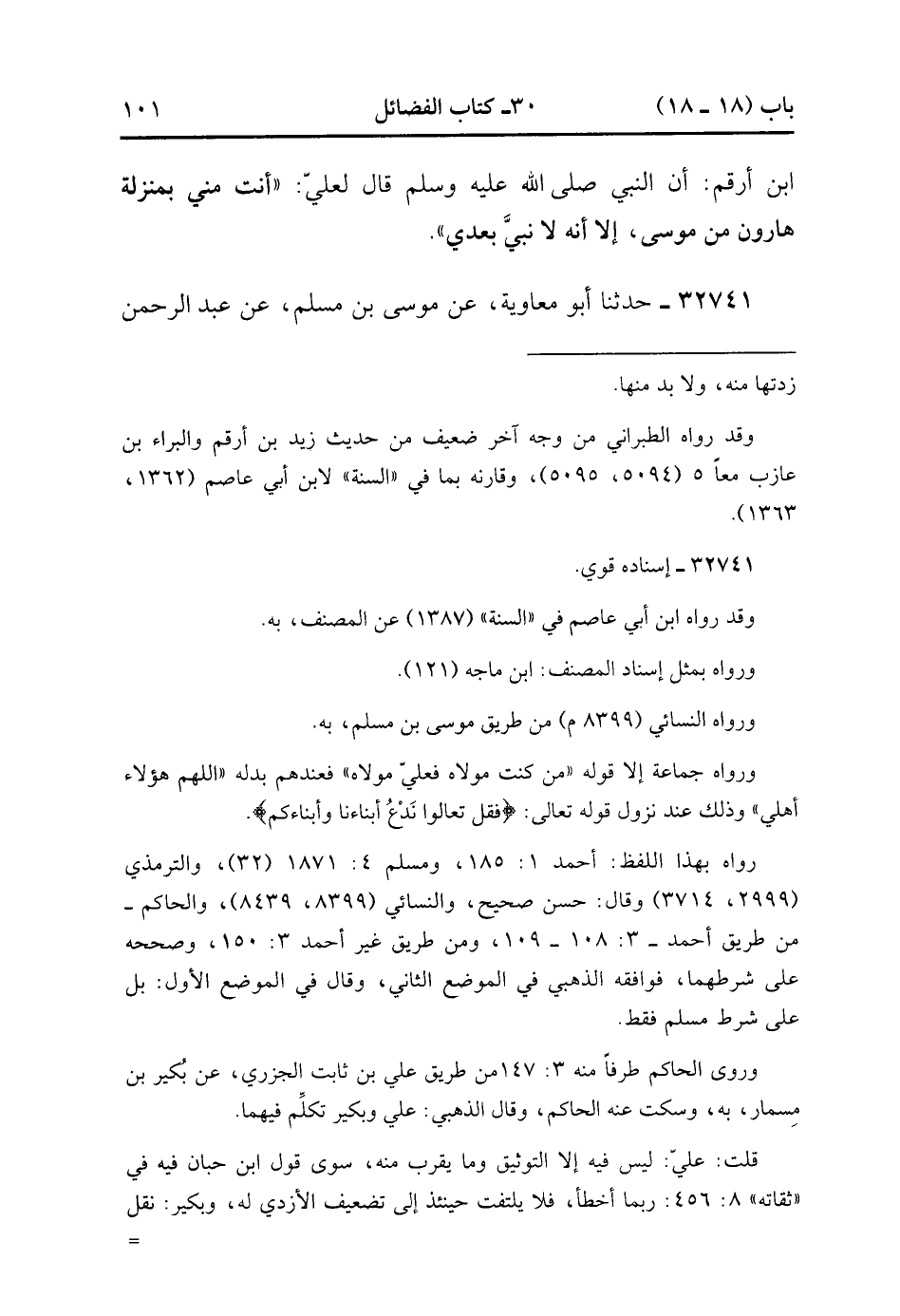 32740- حَدَّثَنَا وَكِيعٌ , عَنْ فُضَيْلِ بْنِ مَرْزُوقٍ , عَنْ عَطِيَّةَ , عَنْ زَيْدِ بْنِ أَرْقَمَ أَنَّ النَّبِيَّ صَلَّى الله عَلَيْهِ وَسَلَّمَ قَالَ لِعَلِيٍّ : أَنْتَ مِنِّي بِمَنْزِلَةِ هَارُونَ مِنْ مُوسَى , إلاَّ أَنَّهُ لَيْسَ نَبِيٌّ بَعْدِي. (12/61).