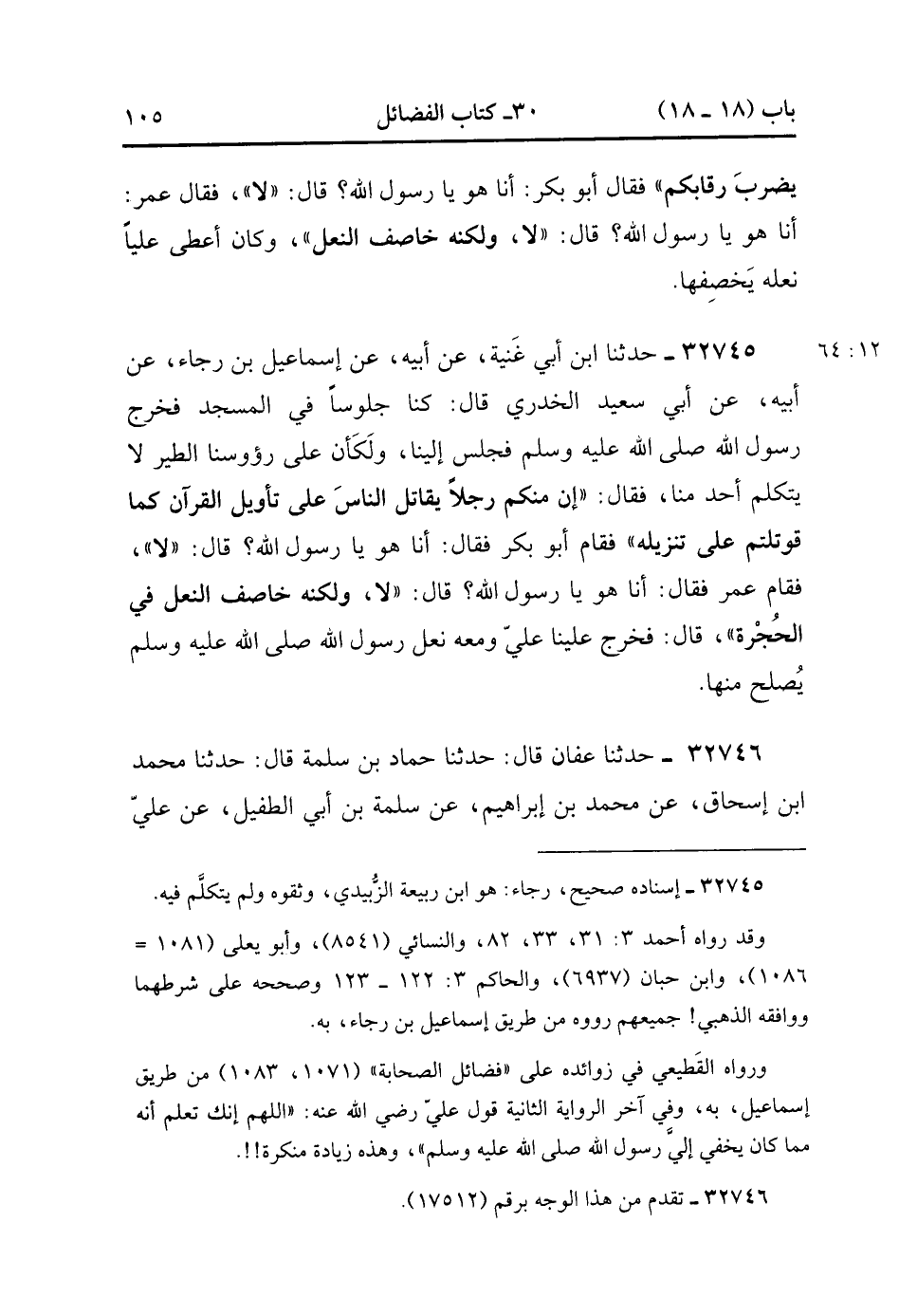 32745- حَدَّثَنَا ابْنُ أَبِي غنية , عَنْ أَبِيهِ , عَنْ إسْمَاعِيلَ بْنِ رَجَاءٍ , عَنْ أَبِيهِ , عَنْ أَبِي سَعِيدٍ الْخُدْرِيِّ , قَالَ : كُنَّا جُلُوسًا فِي الْمَسْجِدِ فَخَرَجَ رَسُولُ اللهِ صَلَّى الله عَلَيْهِ وَسَلَّمَ فَجَلَسَ إلَيْنَا وَلَكَأَنَّ عَلَى رُؤُوسِنَا الطَّيْرَ , لاَ يَتَكَلَّمُ أَحَدٌ مِنَّا , فَقَالَ : إنَّ مِنْكُمْ رَجُلاً يُقَاتِلُ النَّاسَ عَلَى تَأْوِيلِ الْقُرْآنِ كَمَا قُوتِلْتُمْ عَلَى تَنْزِيلِهِ , فَقَامَ أَبُو بَكْرٍ , فَقَالَ : أَنَا هُوَ يَا رَسُولَ اللهِ , قَالَ : لاَ , فَقَامَ عُمَرُ , فَقَالَ : أَنَا هُوَ يَا رَسُولَ اللهِ , قَالَ : لاَ , وَلَكِنَّهُ خَاصِفُ النَّعْلِ فِي الْحُجْرَةِ , قَالَ : فَخَرَجَ عَلَيْنَا عَلِيٌّ وَمَعَهُ نَعْلُ رَسُولِ اللهِ صَلَّى الله عَلَيْهِ وَسَلَّمَ يُصْلِحُ مِنْهَا.